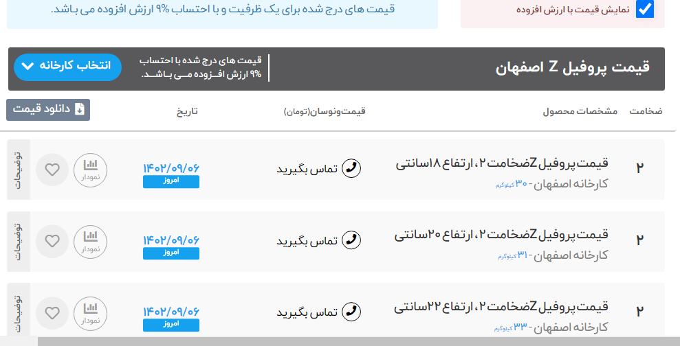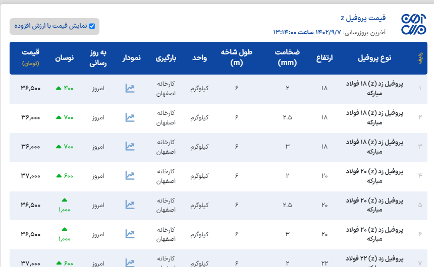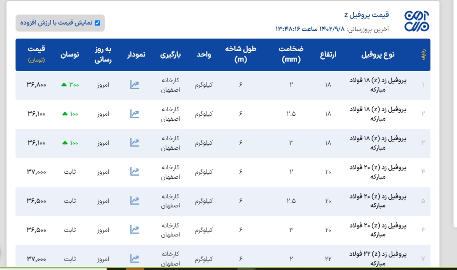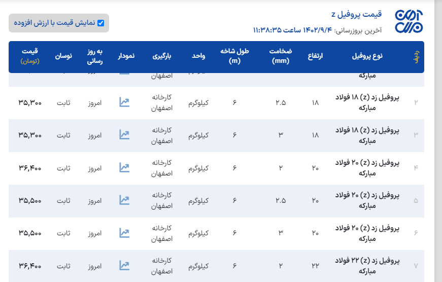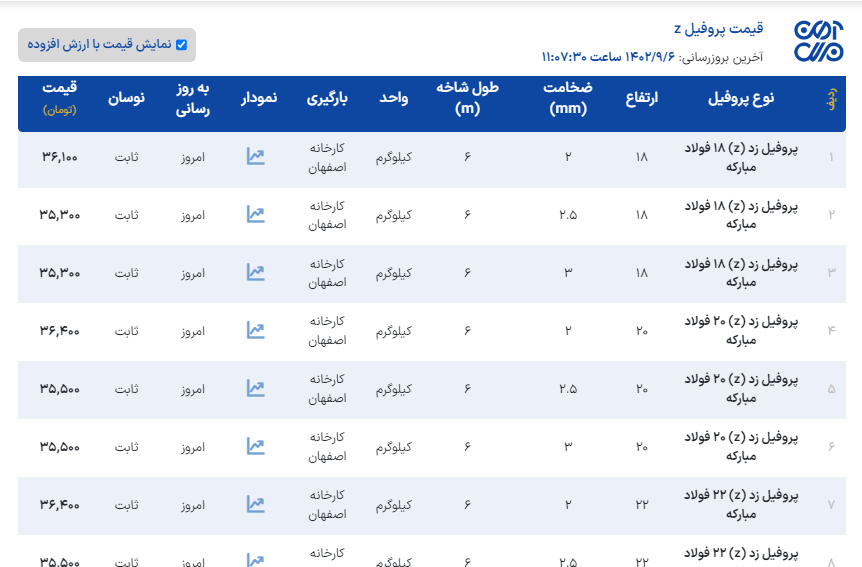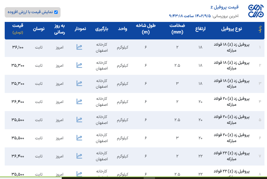 روهینا پیشرو سازه ️ تولید و فروش پروفیل زد پروفیل زد ضخامت 2 میل پروفیل زد ضخامت 2/5 میل پروفیل زد ضخامت 3 میل توضیحات : زد ارتفاع 18(روش تولید: رول فرمینگ ) فروش بصورت ترکیبی قیمت : تلفنی ️ 031-37755737-37753224 ️ 031-37753125-37756039 ️ 031-37750721-37750981 ️031-37769044 09134890341 0937788460