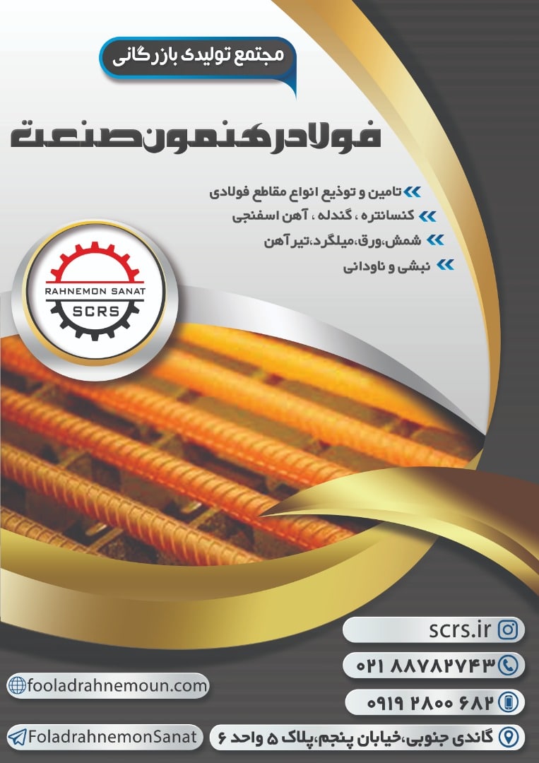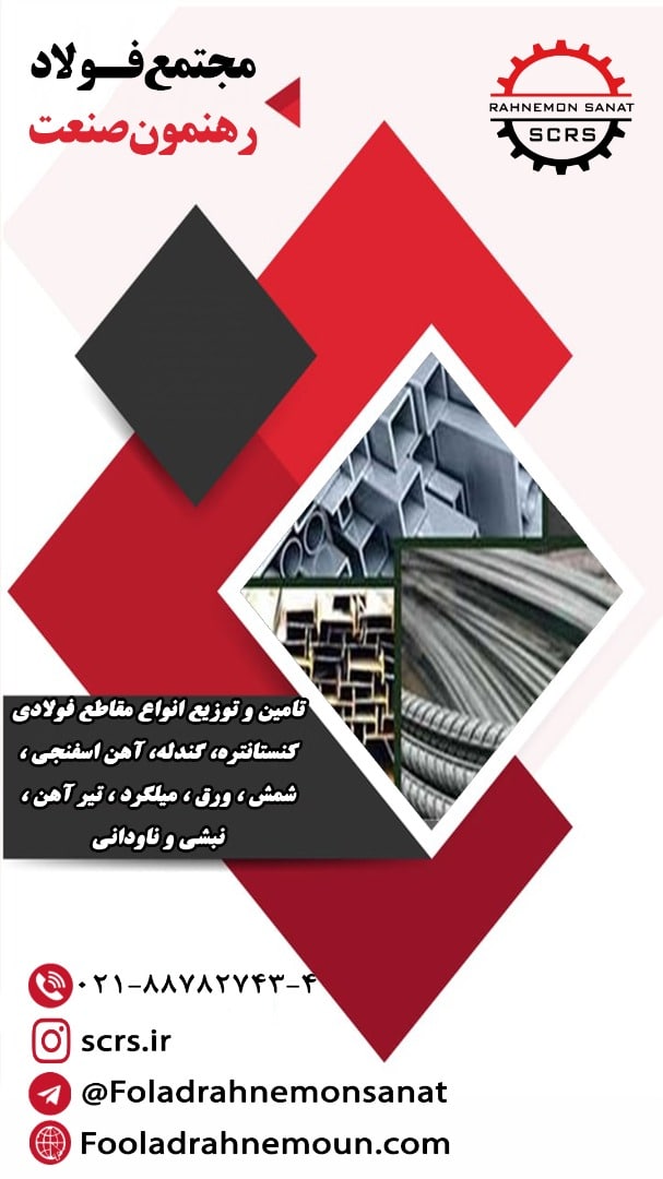 #مجتمع_فولاد_رهنمون_صنعت 🟡تأمین و توزیع انواع: 🔻مقاطع فولادی 🔻انواع میلگرد 🔻تیرآهن 🔻نبشی و ناودانی 🔻انواع ورق فولادی 🔻شمش فولادی و مواد اولیه 🌐www.fooladrahnemon.com ☎️ 021 88782743-5 🆔 https://t.me/foladrahnemonsanat 📌 https://foolad24.com/profile/3709