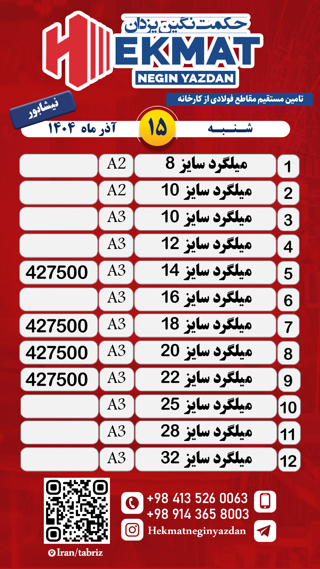#میلگرد امیرکبیر شنبه 1404/09/15 📞استعلام قیمت و ثبت سفارش: ☎️☎️☎️ 04135260063 📱📱📱09143658003 ⚜️ بازرگانی حکمت نگین یزدان ⚜️ نگینی در صنعت فولاد ایران