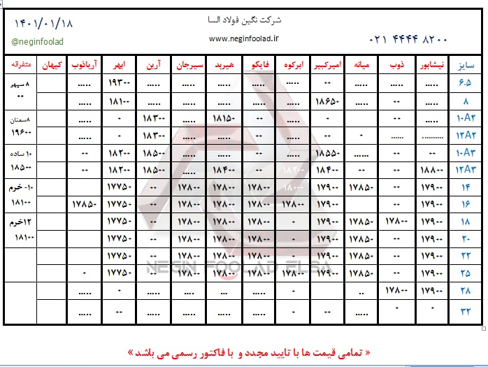 🔸میلگرد 10 پرشین آ3 : 18650 میلگرد 12 پرشین آ3 :18550 🔸میلگرد 28 کاشان : 18050 🔸میلگرد 28 ذوب : 18050 🔸میلگرد نیشابور در کارخانه 17750 ☎️02153236 ☎️02154857000