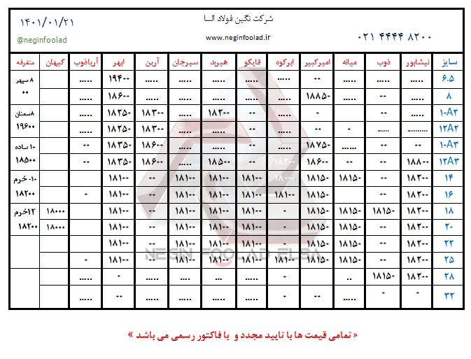 میلگرد 10 نیشابور : —- میلگرد 12 نیشابور : —- میلگرد 14 نیشابور : 18150 میلگرد 16 نیشابور : 18150 میلگرد 18 نیشابور : 18150 میلگرد 20 نیشابور : 18150 میلگرد 25 نیشابور : 18150 میلگرد 28 نیشابور: 18150 میلگرد 32 نیشابور : —— میلگرد نیشابور در کارخانه 17750