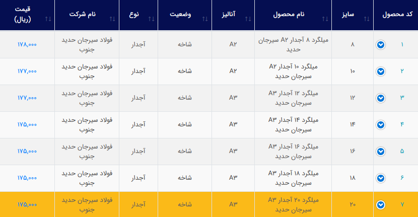 کاوه تیکمه داش گرید A3 سایز 8 : 17,980 گرید A3 سایز 10 :17,780 گرید A2 سایز 8 : 17,780 گرید A2 سایز 10 : 17,580 گرید A3 سایز 12 : 17,580 گرید A3 سایز 14 _ 32 : 17,280 گرید A4 سایز 20 _ 22 : .......... میلگردهای ساده: گرید A1 سایز 8 : 17,800