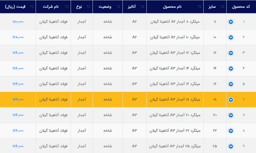 آذرفولادامین تیکمه داش میلگرد آجدار A2 سایز 8 : 174000 میلگرد آجدار A2 سایز10: 172000 میلگرد آجدار A3 سایز 12 : 172000 میلگرد آجدار A3 سایز 14الی 32 : 169000 میلگرد آجدار A3 سایز 10 : 175000 ۰۹۱۲۴۹۷۸۶۸۸ ۰۹۱۲۵۴۰۸۹۳۸