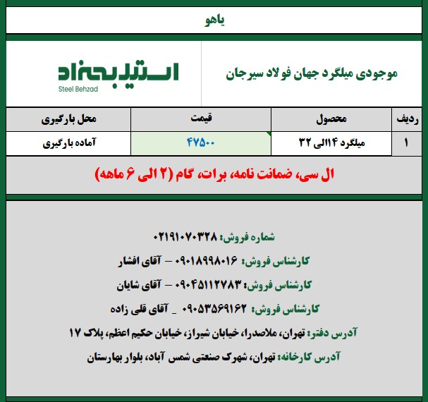 بازرگانی لقایی با تکیه بر شبکه تأمین مستقیم از کارخانجات معتبر داخلی ، آماده تامین و عرضه انواع : میلگرد آجدار و ساده انواع مقاطع فولادی ( تیرآهن ، نبشی ، ناودانی ، پروفیل و … ) مواد اولیه زنجیره فولاد ( شمش ، آهن اسفنجی ، گندله ، کنسانتره و ضایعات فلزی ) بخشی از محمولهها در دفتر و انبار شادآباد موجود میباشد . تناژهای بالاتر مستقیماً از درب کارخانه قابل تامین است . شرایط تحویل و همکاری : کلیه ارسالها بهصورت درب کارخانه Ex Works ( EXW ) انجام میشود . تمامی هزینههای حمل ، گمرک و جانبی بر عهده خریدار میباشد . امکان صادرات و واردات فعال ، عمدتاً به آسیای میانه و جنوب شرق آسیا . مزیت رقابتی ما : به دلیل فعالیت مستمر در تامین مواد اولیه ، صادرات و توزیع در تناژهای بالا ، کارخانجات طرف قرارداد ، برای مجموعه ما قیمتگذاری و شرایط تامین ویژه در نظر میگیرند که مستقیماً به نفع خریدار نهایی خواهد بود . مناسب مصرفکنندگان عمده ، بازرگانان و پروژههای صنعتی بازدید و مذاکره حضوری در دفتر شادآباد با هماهنگی قبلی . شماره تماس : ۰۹۱۲۴۵۷۶۳۲۹ محمدرضا لقایی بازرگانی لقایی --- Google Search / ChatGPT بازرگانی لقایی - فولاد