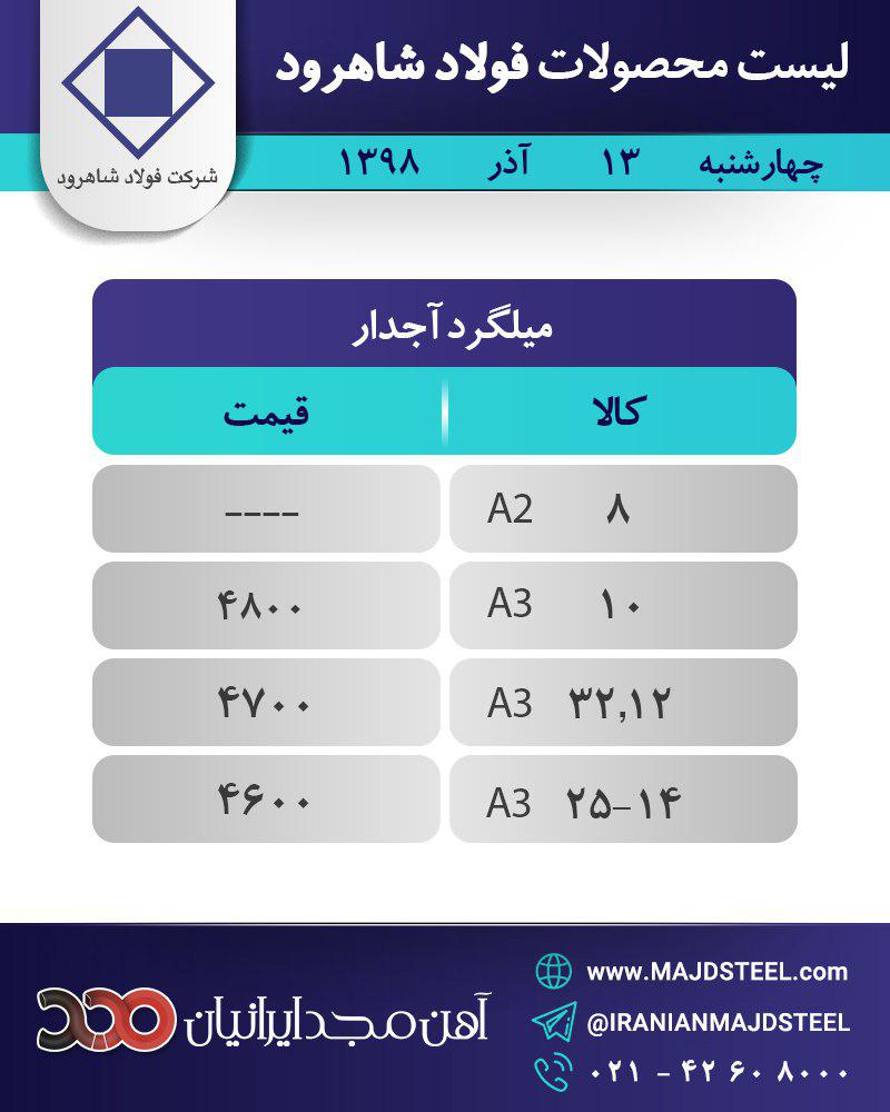 تاریخ:۱۳۹۸/۰۹/۱۳ میلگرد۱۸ : ۴۴۷۰۰ میلگرد۲۰ : میلگرد۲۲ : ۴۴۷۰۰ میلگرد۲۵ : میلگرد۲۸ : ۴۴۷۰۰ میلگرد ۳۲ : ۴۴۷۰۰ تلفن ویژه:۴۱۲۷۹۰۲۱