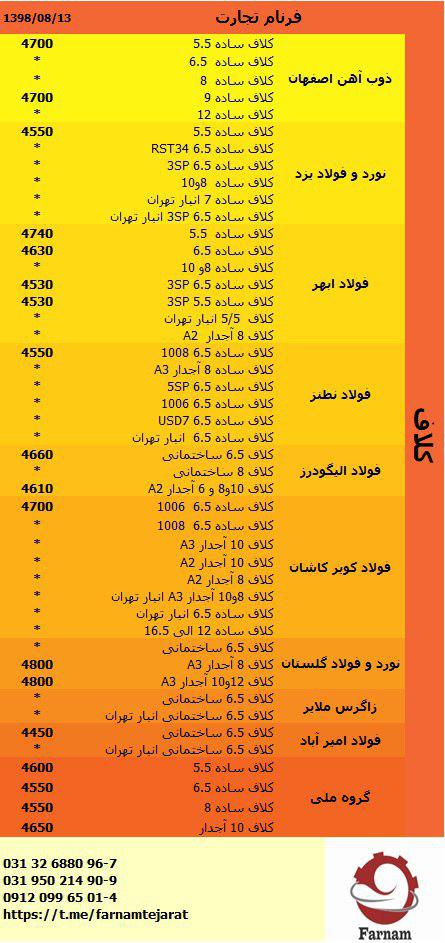 میلگرد۱۰ : ۴۶۹۰۰ میلگرد۱۲ : ۴۵۳۰۰ میلگرد۱۴ : ۴۳۶۰۰ میلگرد۱۶ : ۴۳۶۰۰ میلگرد۱۸ : میلگرد۲۰ : ۴۳۶۰۰ میلگرد۲۲ : ۴۳۶۰۰ میلگرد۲۵ : میلگرد۲۸ : میلگرد ظفربناب میلگرد ۸ : ۴۵۵۰۰ میلگرد۱۰ : ۴۵۰۰۰ میلگرد۱۲ : ۴۵۰۰۰ میلگرد۱۴ : ۴۴۵۰۰ میلگرد۱۶ : ۴۴۵۰۰ میلگرد۱۸ : ۴۴۵۰۰ میلگرد۲۰ : ۴۴۵۰۰ میلگرد۲۲ : ۴۴۵۰۰ میلگرد۲۵ : ۴۴۵۰۰ میلگرد۲۸ : ۴۴۵۰۰ تیر۱۴ : ۴۵۶۰۰ تلفن ویژه:021۴۱۲۷۹