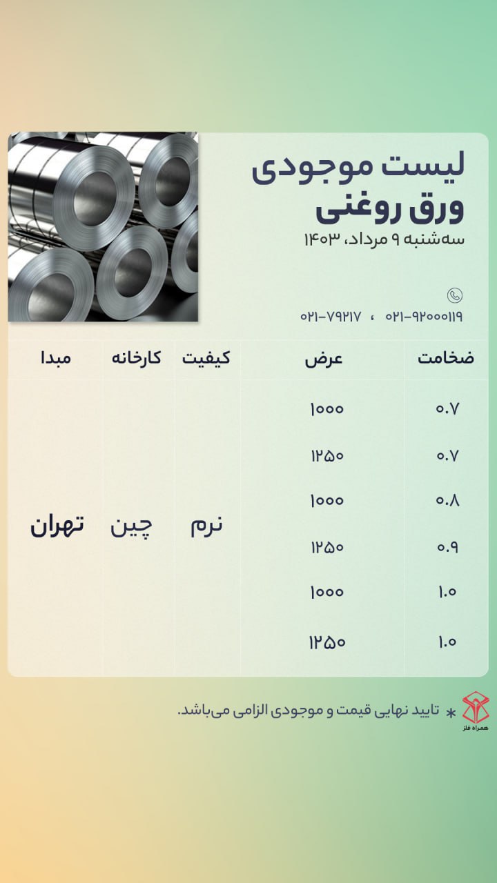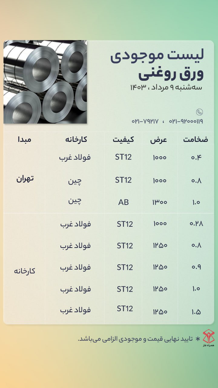 ⚜️#همراه_فلز_آسیا ⚜️ ❇️تهیه و تامین انواع ورق های فولاد ی و استیل 💠ورق روغنی 💠ورق سیاه 💠ورق گالوانیزه 💠انواع مقاطع طویل (تیر آهن و میلگرد و نبشی و ناودانی و پروفیل و لوله ) انواع استیل #جهت_مشاهده_پروفایل_همراه_فلز_آسیا https://foolad24.com/profile/10985 #جهت_مشاهده_اعلام_موجودی_همراه_فلز_آسیا https://foolad24.com/profile/10985/inventory 🔆فروش آنلاین و تلفنی به قیمت کارخانه می کوشیم، اعتمادی پولادین بسازیم. بخش فروش : 📲 09122376560 📲 09129097493 📲کارشناس خرید: 09195163461 📞02179217 📞02192000119 https://hamrahfelez.org 🌐https://t.me/hamrahfelez 🌐https://instagram.com/hamrahfelez