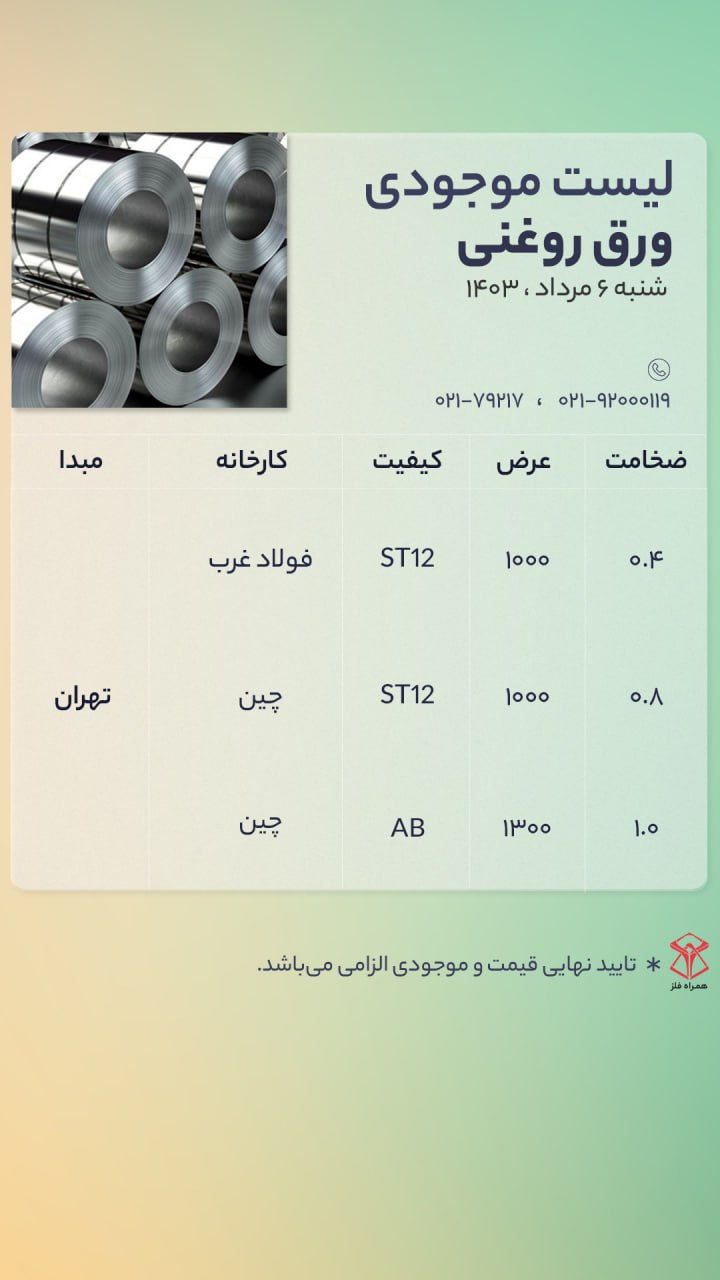 ☎️راه های ارتباطی با کارشناسان فروش 021-92000119 021-79217 👤آقای سعید فراهانی (داخلی 115 و 114) 👤آقای حسین فراهانی (داخلی 102 و 101) 👤خانم سلحشور (داخلی 123 و 122) 👤آقای حسین کرمی (داخلی 210) 👤مدیر بازرگانی: آقای مهدی احمدیان (داخلی 106 و 105) 🌐موجودی ورق روغنی همراه فلز (https://hamrahfelez.org/oiled-sheet/)