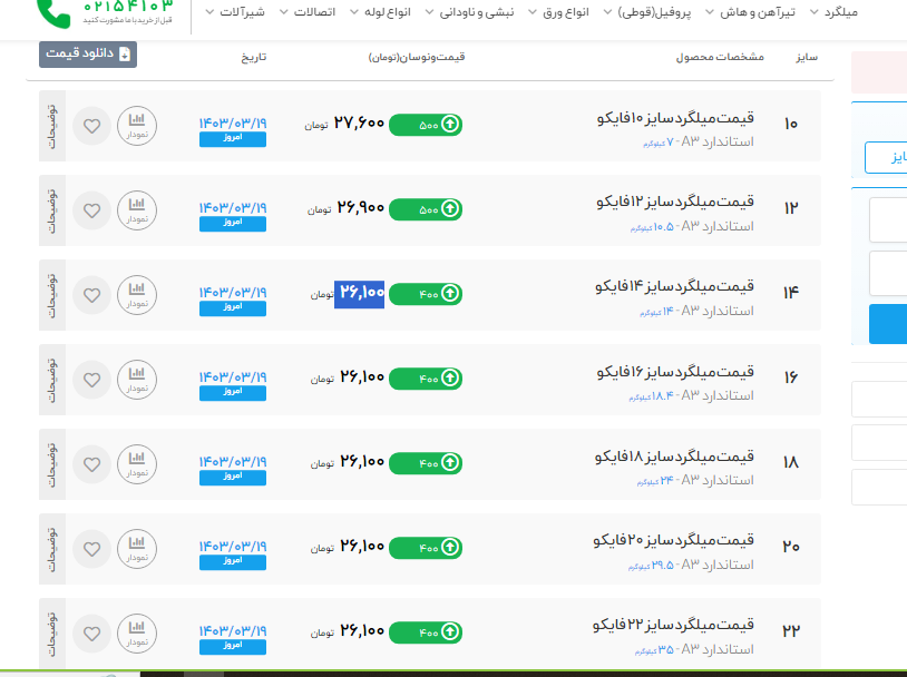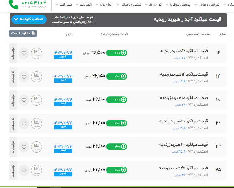 محصول قیمت قیمت (با مالیات) شنبه 1403/03/19 ساعت 14:28 تیرآهن 12 ذوب آهن 12 متری انبار تهران 3,780,000 تیرآهن 14 ذوب آهن 12 متری انبار تهران 4,600,000 تیرآهن 16 ذوب آهن 12 متری انبار تهران 5,670,000 تیرآهن 18 ذوب آهن 12 متری انبار تهران 6,740,000 تیرآهن 20 ذوب آهن 12 متری انبار تهران 8,320,000 تیرآهن 22 ذوب آهن 12 متری انبار تهران 9,700,000 تیرآهن 24 ذوب آهن 12 متری انبار تهران 10,800,000 تیرآهن 27 ذوب آهن 12 متری انبار تهران 12,680,000 تیرآهن 30 ذوب آهن 12 متری انبار تهران 15,820,000 تیرآهن 12 ذوب آهن بنگاه اصفهان 3,810,000 تیرآهن 14 ذوب آهن بنگاه اصفهان 4,580,000 تیرآهن 16 ذوب آهن بنگاه اصفهان 5,580,000 تیرآهن 18 ذوب آهن بنگاه اصفهان 6,750,000 تیرآهن 20 ذوب آهن بنگاه اصفهان 8,250,000 تیرآهن 22 ذوب آهن بنگاه اصفهان 9,500,000 تیرآهن 24 ذوب آهن بنگاه اصفهان 10,600,000 تیرآهن 27 ذوب آهن بنگاه اصفهان 12,500,000 تیرآهن 30 ذوب آهن بنگاه اصفهان 15,820,000 تیرآهن 12 ذوب آهن کارخانه 30,000 تیرآهن 14 ذوب آهن کارخانه 29,510 تیرآهن 16 ذوب آهن کارخانه 29,200 تیرآهن 18 ذوب آهن کارخانه 29,000 تیرآهن 20 ذوب آهن کارخانه 30,400 تیرآهن 22 ذوب آهن کارخانه 29,600 تیرآهن 24 ذوب آهن کارخانه 28,800 تیرآهن 27 ذوب آهن کارخانه 28,800 تیرآهن 30 ذوب آهن کارخانه 30,800 تیرآهن 14 فایکو 12 متری تهران 3,880,000 تیرآهن 16 فایکو 12 متری تهران 4,980,000 تیرآهن 18 فایکو 12 متری تهران 6,000,000 تیرآهن 22 فایکو 12 متری تهران 9,440,000 تیرآهن 14 فایکو 12 متری کارخانه 28,610 تیرآهن 16 فایکو 12 متری کارخانه 28,610 تیرآهن 18 فایکو 12 متری کارخانه 28,610 تیرآهن 14 یزد 12 متری تهران 3,800,000 تیرآهن 16 یزد 12 متری تهران 4,810,000 تیرآهن 18 یزد 12 متری تهران 5,920,000 تیرآهن 20 یزد 12 متری تهران 7,560,000 تیرآهن 22 یزد 12 متری تهران 9,110,000 تیرآهن 24 یزد 12 متری تهران 10,300,000 تیرآهن 14 یزد 12 متری کارخانه 28,500 تیرآهن 16 یزد 12 متری کارخانه 28,500 تیرآهن 18 یزد 12 متری کارخانه 28,500 تیرآهن 20 یزد 12 متری کارخانه 31,000 تیرآهن 22 یزد 12 متری کارخانه 29,800 تیرآهن 24 یزد 12 متری کارخانه 28,800 تیرآهن 16 ماهان 12 متری 4,460,000 تیرآهن 18 ماهان 12 متری 5,460,000 تیرآهن 14 کرمانشاه 12 متری 3,840,000 ☎️ شماره تماس: شماره چهار رقمی تهران 1849 شهرستانها 02186020094 instagram.com/digi.ahan :اینستاگرام🆔 🌐وبسایت: www.digiahan.com ✅تلگرام: https://t.me/Digiahan1849