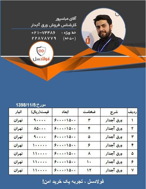 به نام خدا 1398/11/6 کارخانه 8 فولاد راد همدان:5445 10 فولاد راد همدان:5415 12 فولاد راد همدان:5365. 14 فولاد راد همدان:5315 16 فولاد راد همدان:5315 18 فولاد راد همدان:5315 20 فولاد راد همدان:5315 22 فولاد راد همدان:5315 25 فولاد راد همدان:5345 28 فولاد راد همدان:5345 32 فولاد راد همدان: