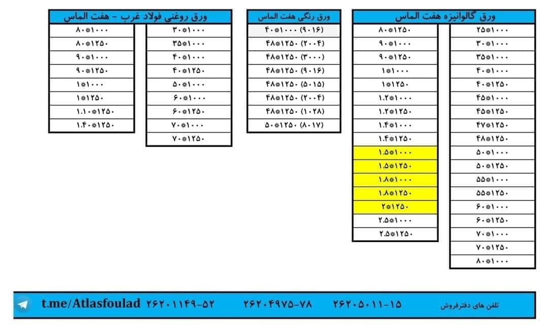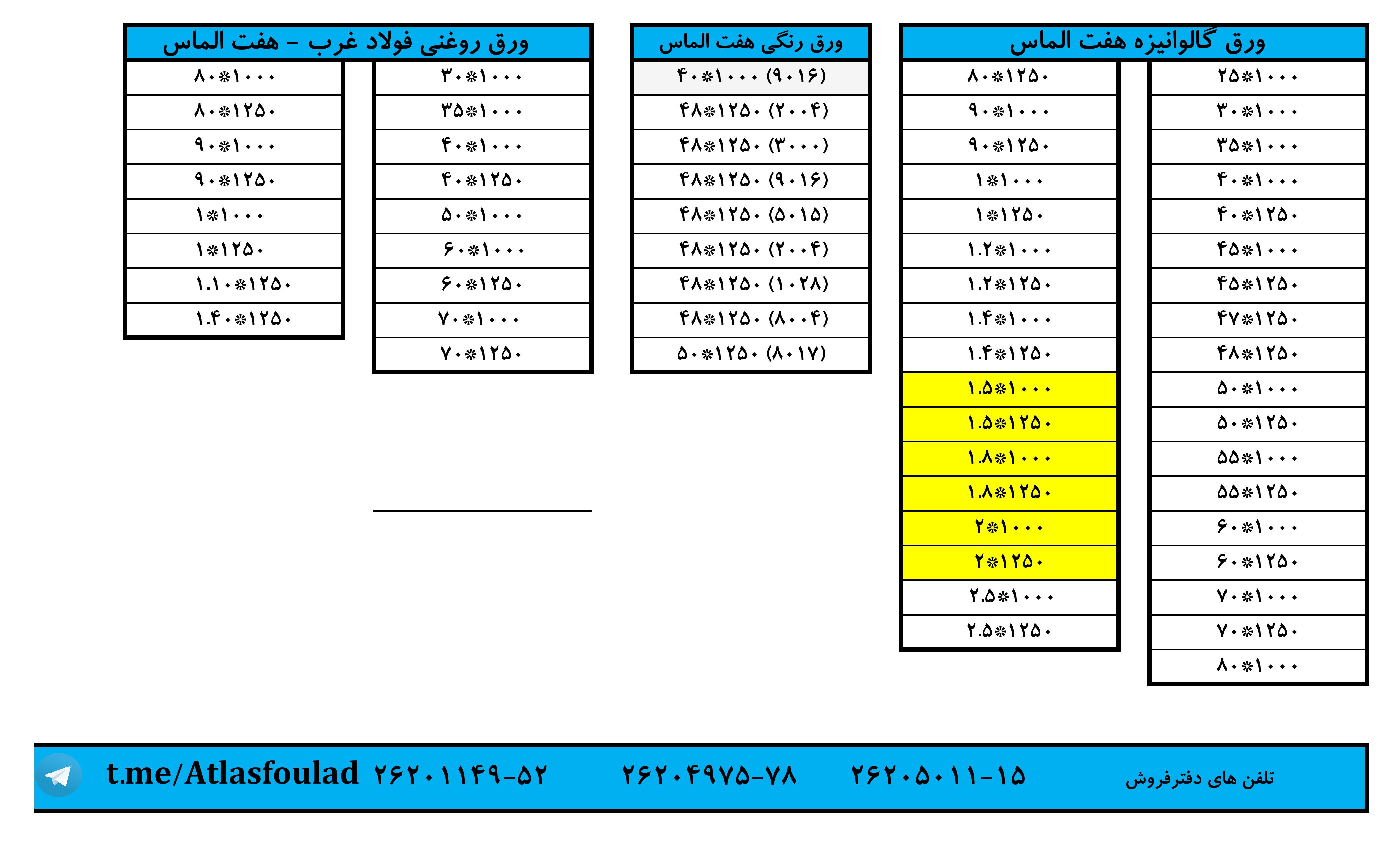 #اطلس_فولاد ۲۵*۱۰۰۰ ۸۰*۱۲۵۰ ۳۰*۱۰۰۰ ۹۰*۱۰۰۰ ۳۵*۱۰۰۰ ۹۰*۱۲۵۰ ۴۰*۱۰۰۰ ۱*۱۰۰۰ ۴۰*۱۲۵۰ ۱*۱۲۵۰ ۴۵*۱۰۰۰ ۱.۲*۱۰۰۰ ۴۵*۱۲۵۰ ۱.۲*۱۲۵۰ ۴۷*۱۲۵۰ ۱.۴*۱۰۰۰ ۴۸*۱۲۵۰ ۱.۴*۱۲۵۰ ۵۰ ...
