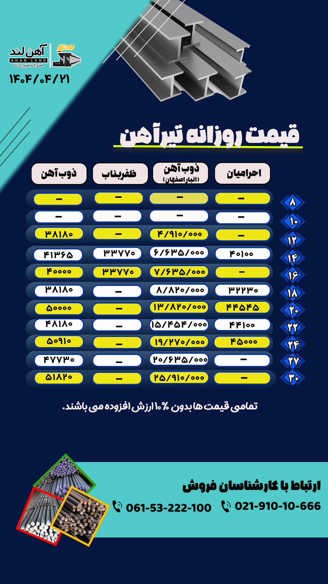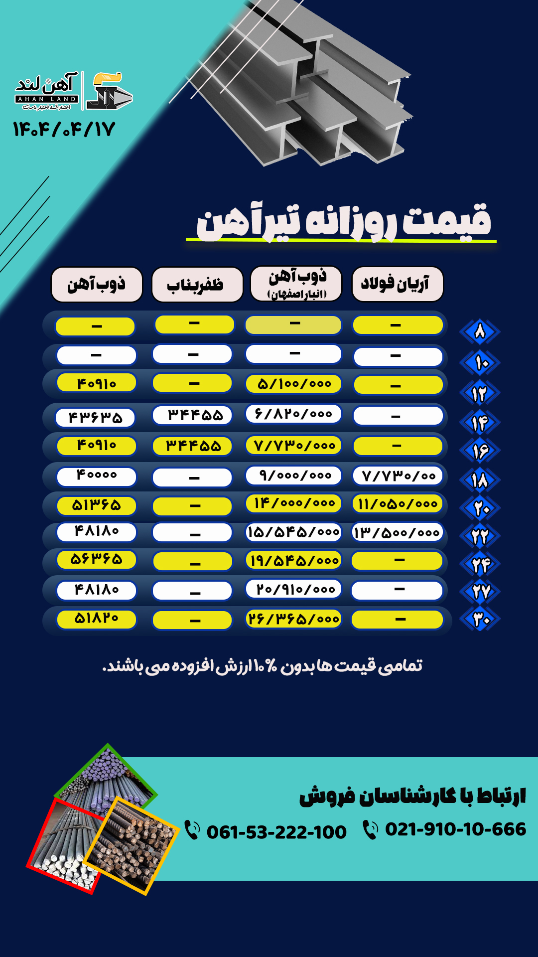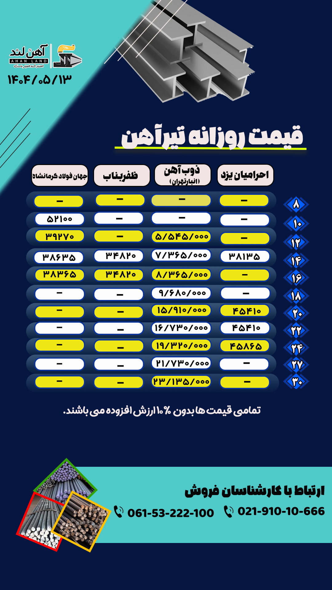 تاریخ: 1404/05/02 تیرآهن ✅ جهت خرید، مشاوره و ارتباط با کارشناسان فروش: https://zil.ink/ahanland ☎️ 02191010666 ☎️ 06153222100