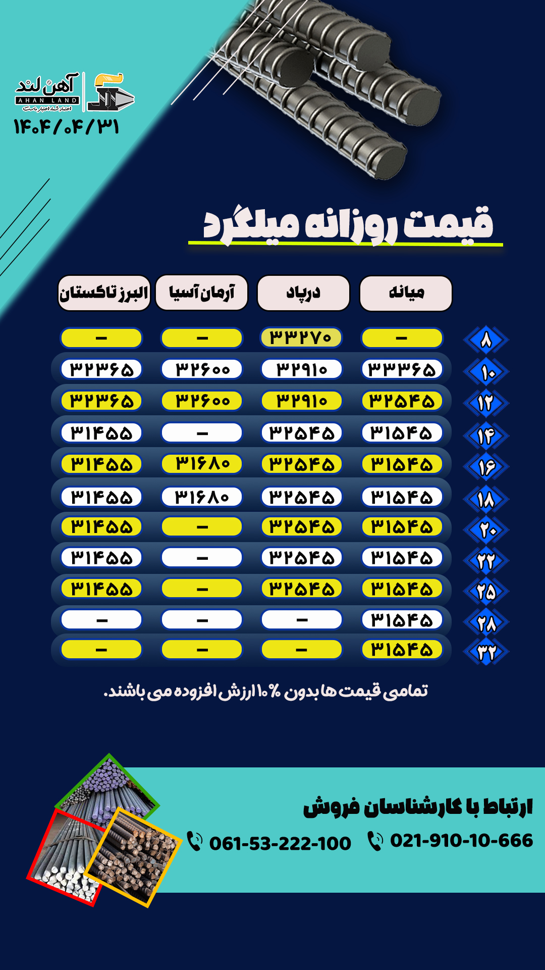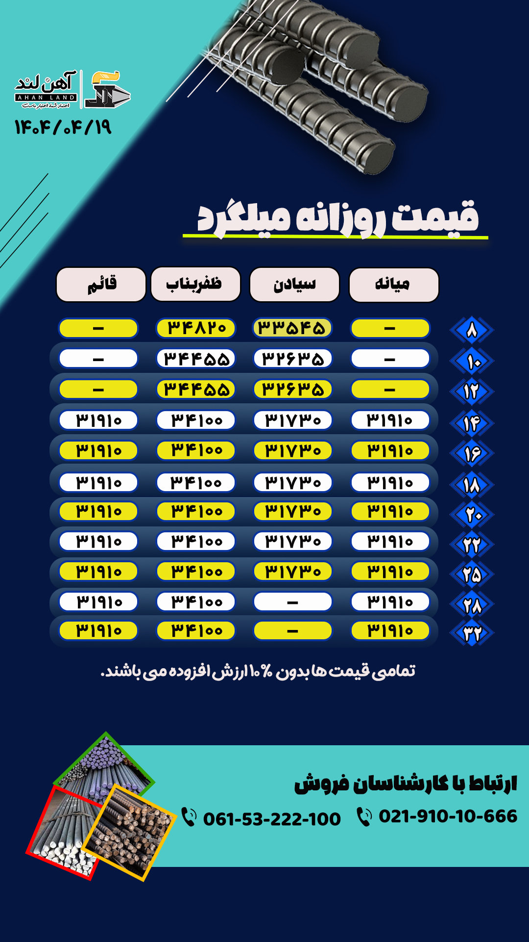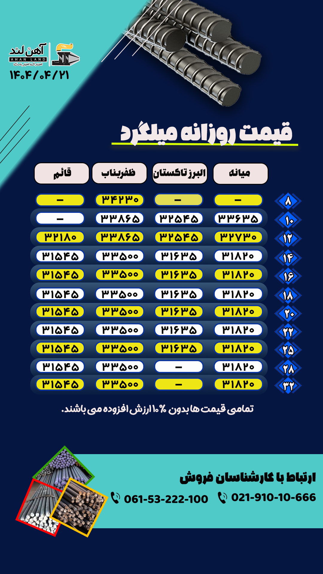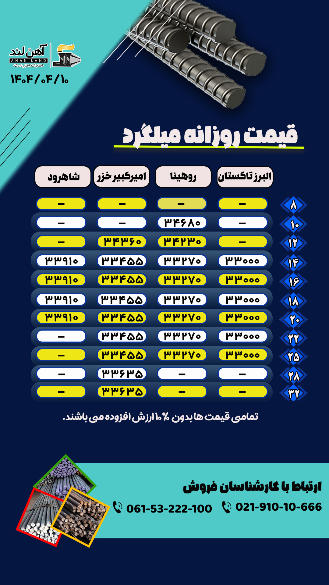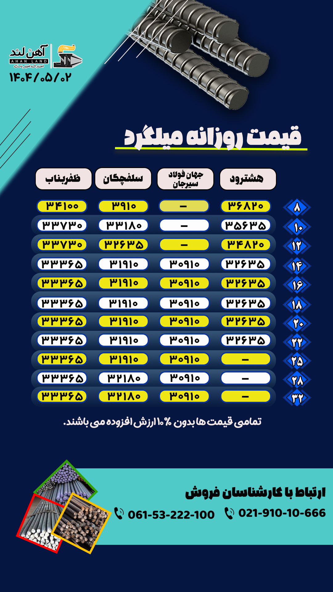🗓 یکشنبه 1403/10/30 🚛بارگیری #کارخانه 🔸ثابت A2 میلگرد 10↔️ 31300 تومان میلگرد 12↔️ 31300 تومان A3: میلگرد 10 ↔️ 31800 تومان میلگرد 12 ↔️ 31800 توم ...