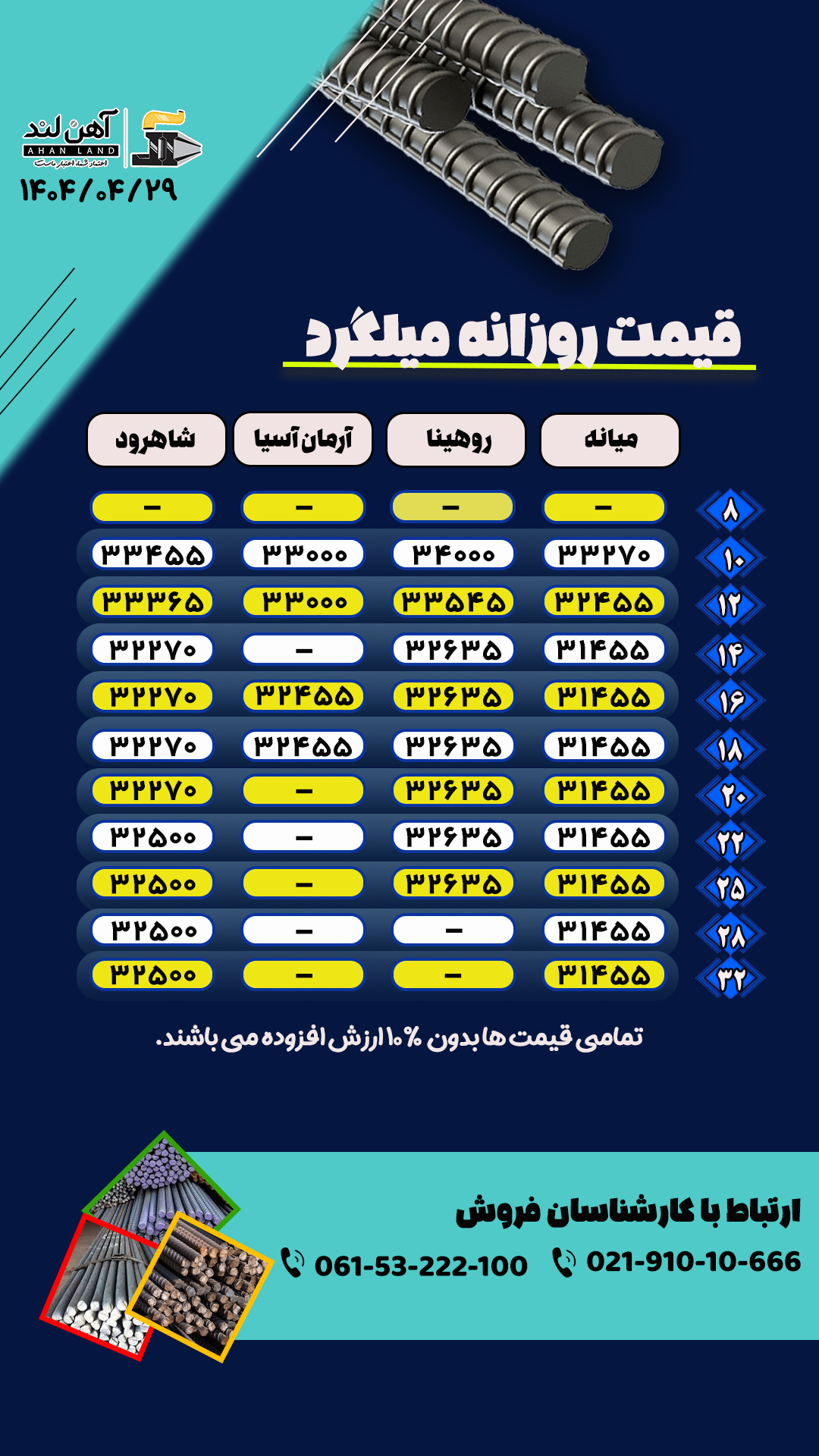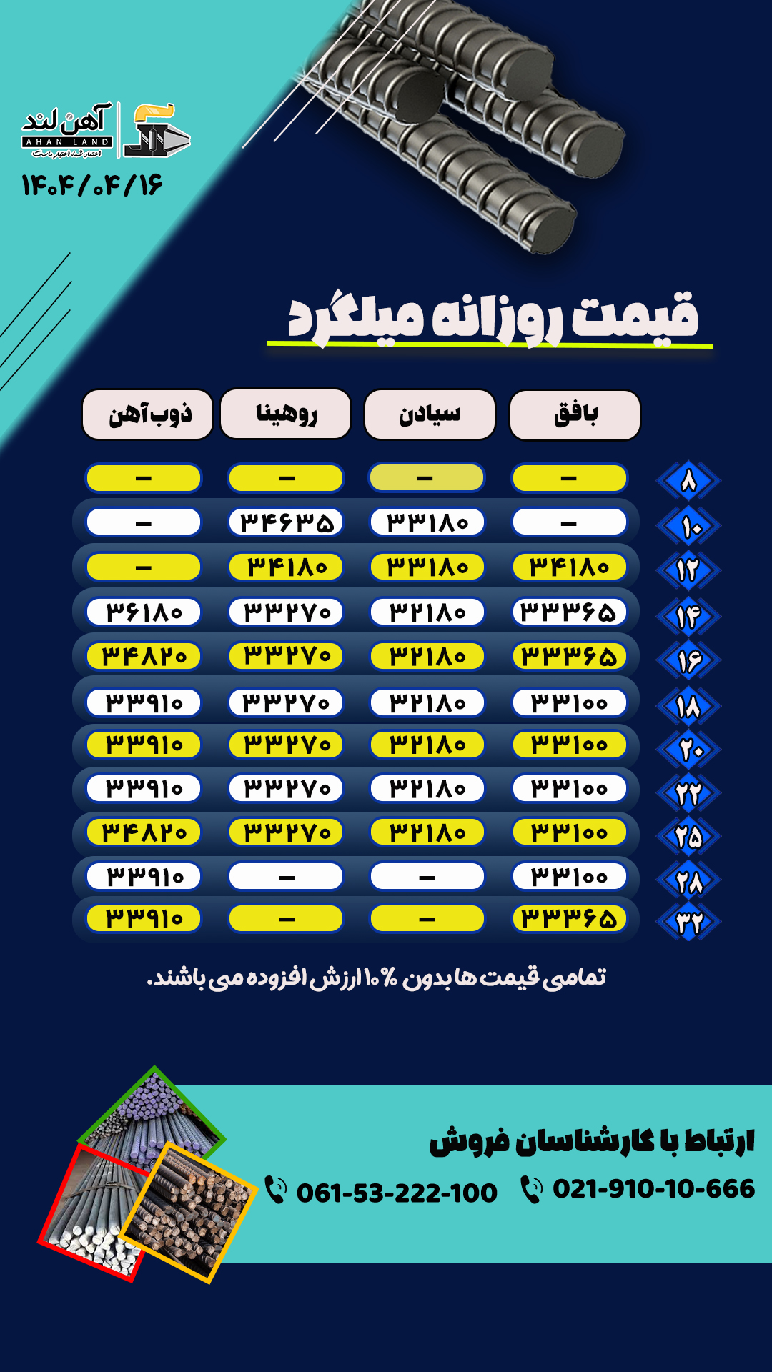 🗓دوشنبه 1403/11/01 🚛 بارگیری# کارخانه 🔺افزایش میلگرد 16 ⏪ 29600 تومان . ☎️ 02191010666 ☎️ 06153222100