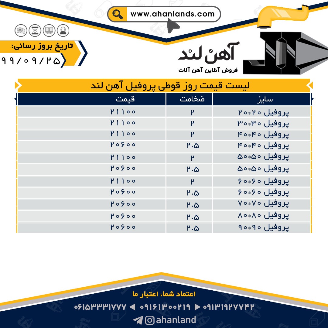 🔴آهن لند🔴 لیست قیمت انواع محصولات فولادی در تاریخ: 1399/09/25 ⭕برای مشاهده آنلاین قیمت انواع مقاطع فولادی به وب سایت ما: WWW.AHANLANDS.COM مراجعه فرمایید. ⚜اع ...