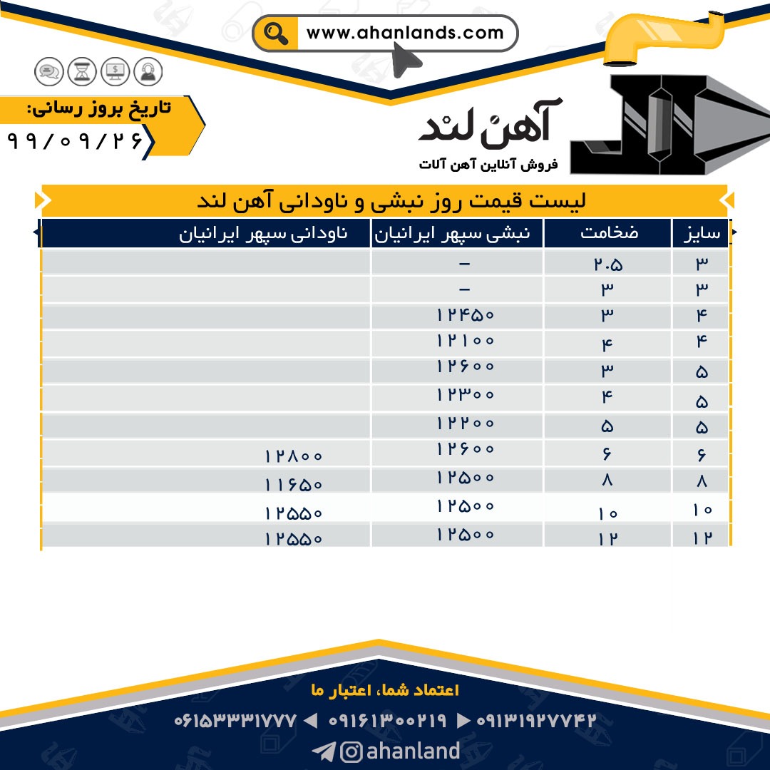 🔴آهن لند🔴 لیست قیمت انواع محصولات فولادی در تاریخ: 1399/09/26 ⭕برای مشاهده آنلاین قیمت انواع مقاطع فولادی به وب سایت ما: WWW.AHANLANDS.COM مراجعه فرمایید. ⚜اع ...