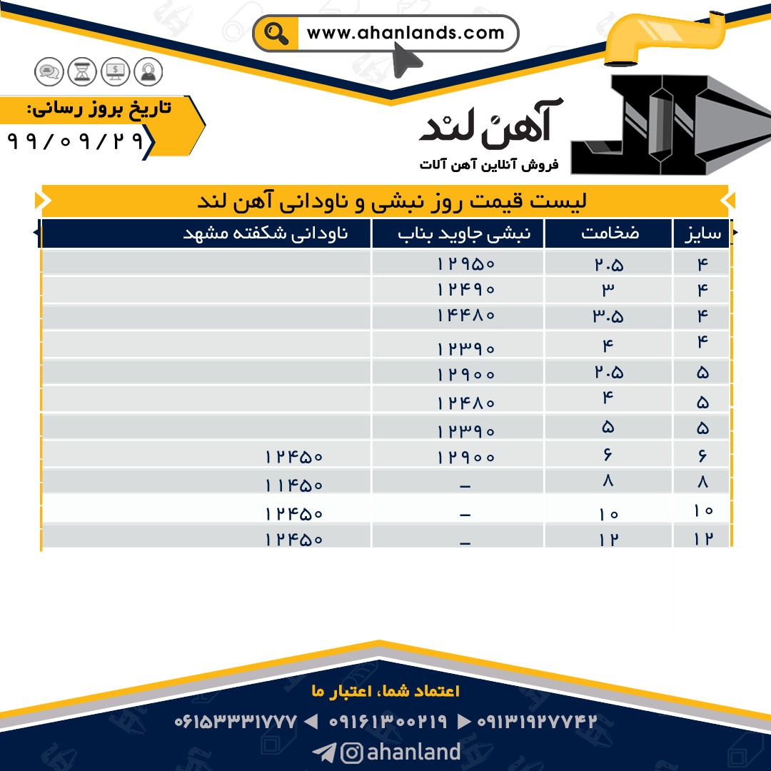 آهن لند🔴 لیست قیمت انواع محصولات فولادی در تاریخ: 1399/09/29 ⭕برای مشاهده آنلاین قیمت انواع مقاطع فولادی به وب سایت ما: WWW.AHANLANDS.COM مراجعه فرمایید. ⚜اعتما ...