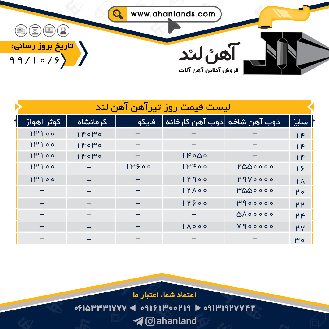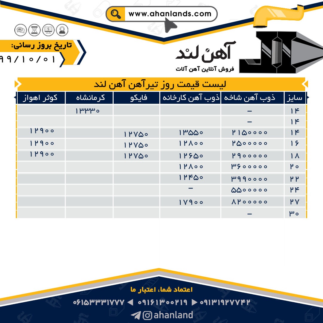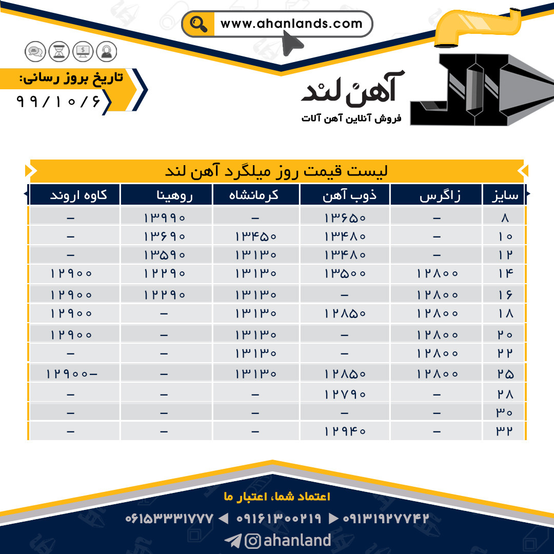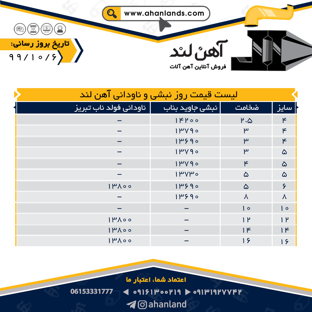 🔴آهن لند🔴 لیست قیمت انواع محصولات فولادی در تاریخ: 1399/10/06 ⭕برای مشاهده آنلاین قیمت انواع مقاطع فولادی به وب سایت ما: WWW.AHANLANDS.COM مراجعه فرمایید. ⚜ا ...