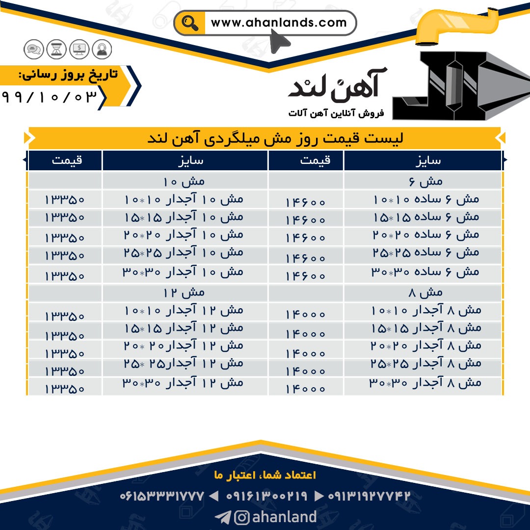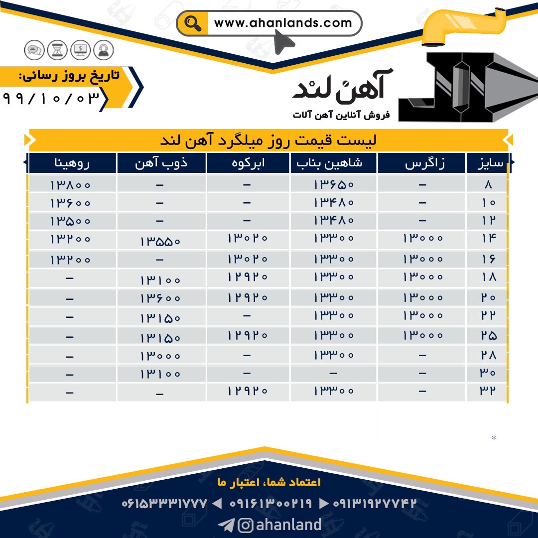 🔴آهن لند🔴 لیست قیمت انواع محصولات فولادی در تاریخ: 1399/10/03 ⭕برای مشاهده آنلاین قیمت انواع مقاطع فولادی به وب سایت ما: WWW.AHANLANDS.COM مراجعه فرمایید. ⚜ا ...