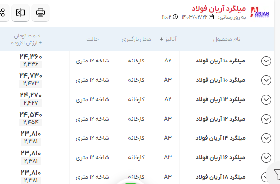 اعلام موجودی مرکز آهن میلگرد آریان فولاد