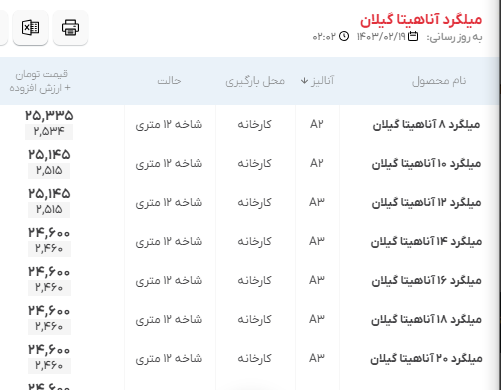 اعلام موجودی مرکز آهن میلگرد آناهیتا گیلان