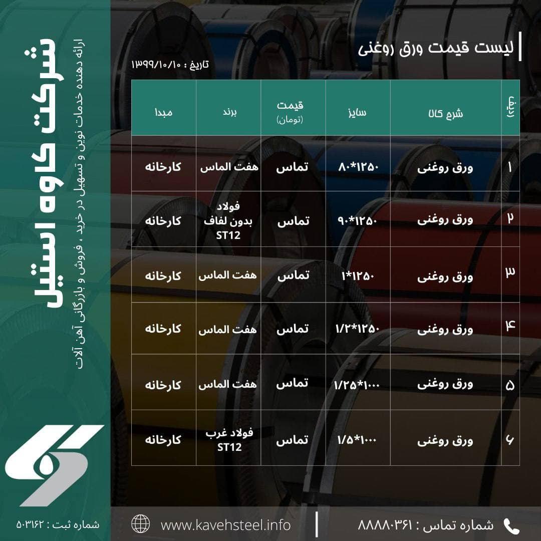 [ Photo ] 📌لیست قیمت #ورق_روغنی 🗓تاریخ : ۱۳۹۹/۱۰/۱۰ شماره های تماس : 📞 02188880361 📞02188782852 @steel_kaveh