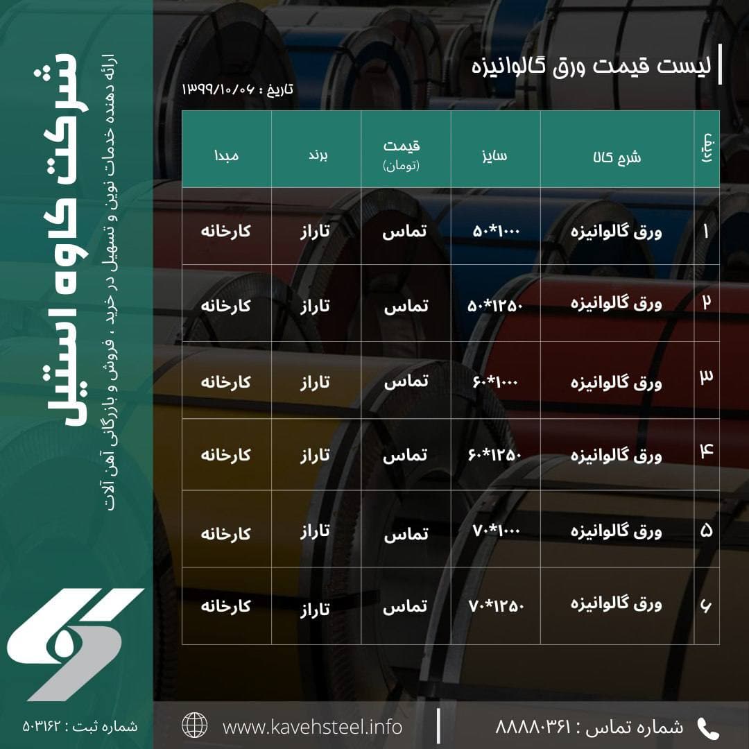 [ Photo ] 📌لیست قیمت #ورق_گالوانیزه (تاراز) 🗓تاریخ : ۱۳۹۹/۱۰/۰۶ شماره های تماس : 📞 02188880361 📞02188782852 @steel_kaveh