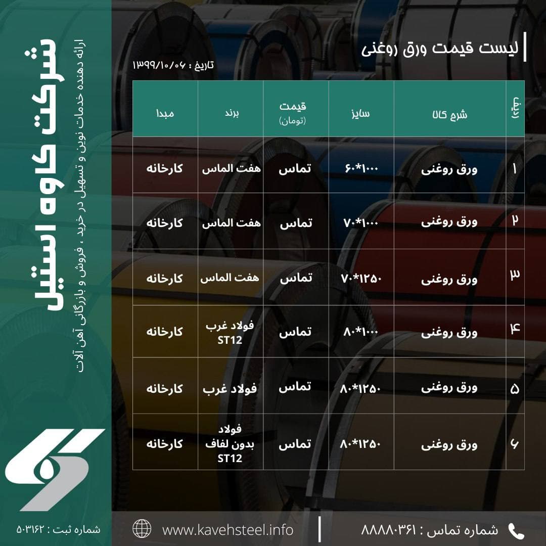 [ Photo ] 📌لیست قیمت #ورق_روغنی 🗓تاریخ : ۱۳۹۹/۱۰/۰۶ شماره های تماس : 📞 02188880361 📞02188782852 @steel_kaveh