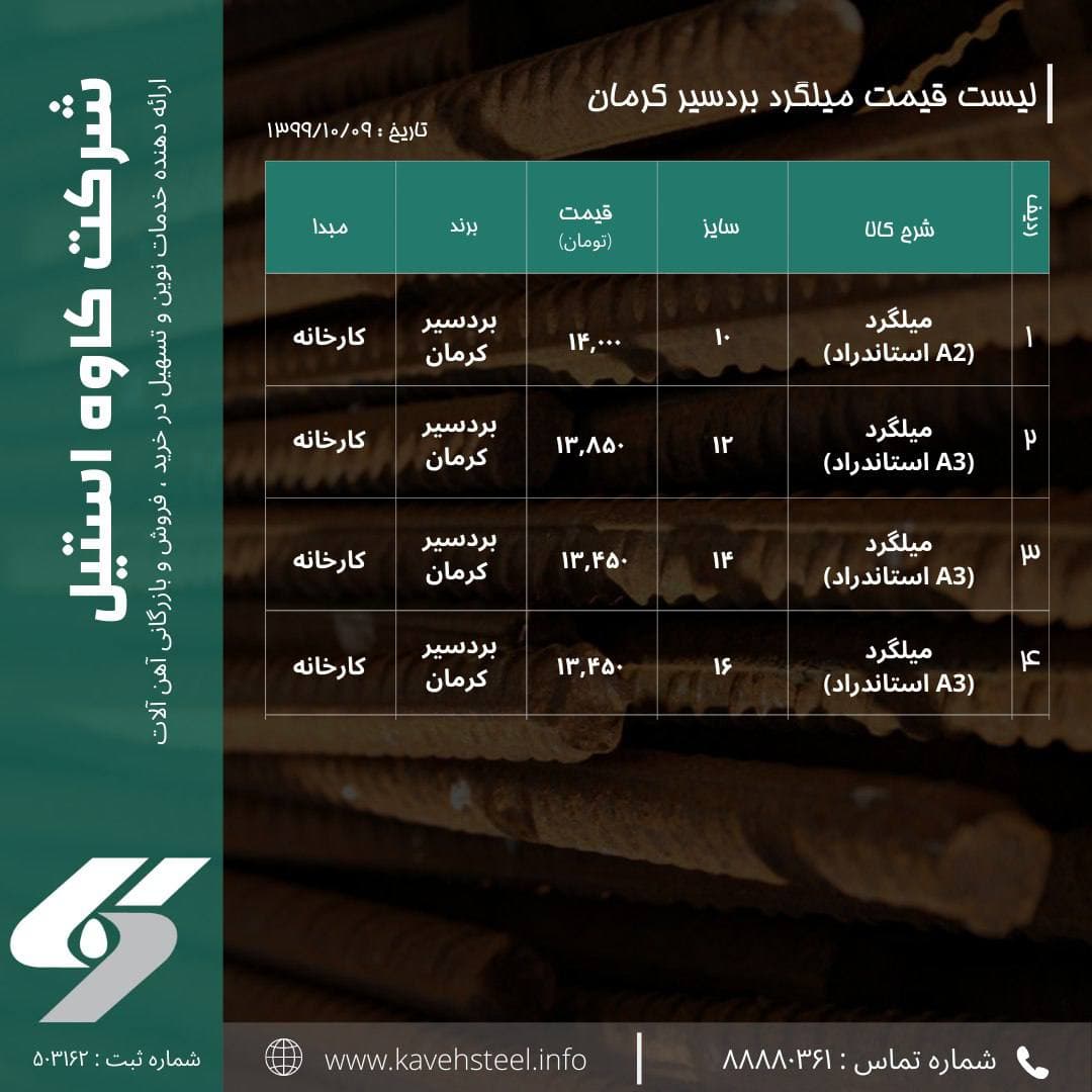 [ Photo ] 📌لیست قیمت #میلگرد(بردسیر کرمان) - کارخانه 🗓تاریخ : ۱۳۹۹/۱۰/۰۹ شماره های تماس : 📞 02188880361 📞02188780310 @steel_kaveh
