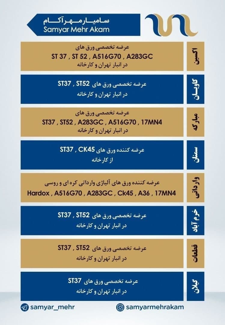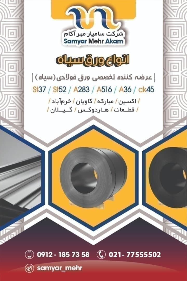 #سامیار_مهر_آکام 🔱عرضه کننده تخصصی ورق فولادی(سیاه)🔱 ❇️اکسین/مبارکه/کاویان/خرم آباد ❇️قطعات/هاردوکس/گیلان 📱0912 185 7358 ☎️021-77555502 🆔@samyar_mehr https: ...