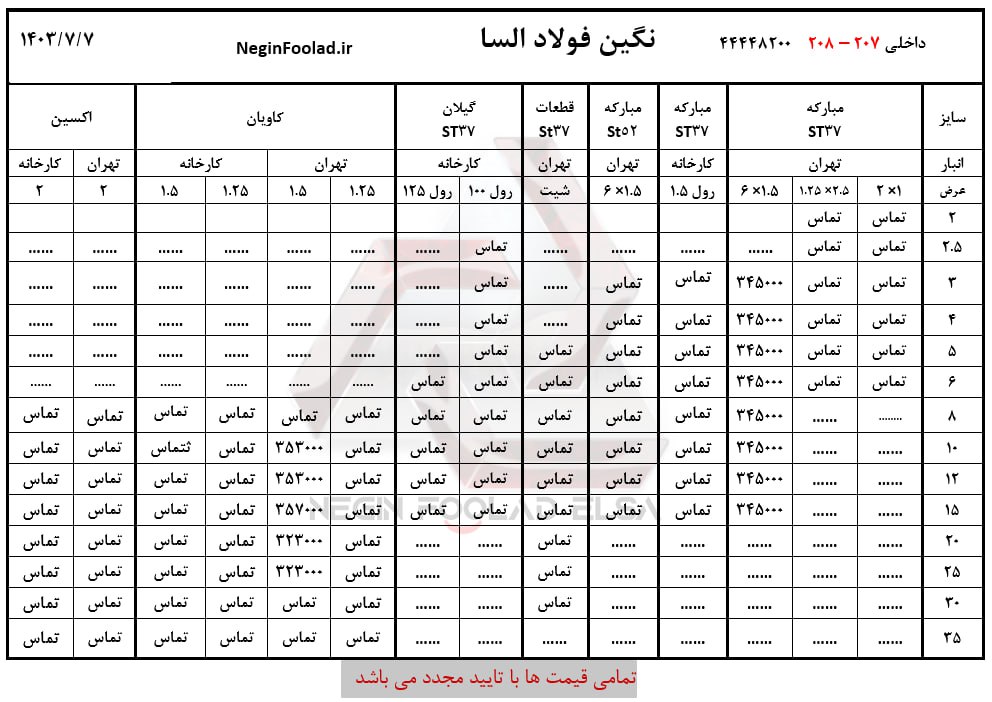 بشی ۳ گوشت ۳ شکفته ⬅️ ۳۵۲۰۰ نبشی ۵ آریان فولاد ⬅️ ۳۴۶۰۰ نبشی ۶ آریان فولاد ⬅️ ۳۴۶۰۰ نبشی ۸ آریان فولاد ⬅️ ۳۴۶۰۰ نبشی ۱۰ آریان فولاد ⬅️ ۳۴۷۰۰ نبشی ۱۲ آریان ...