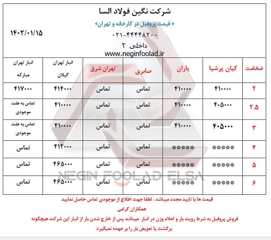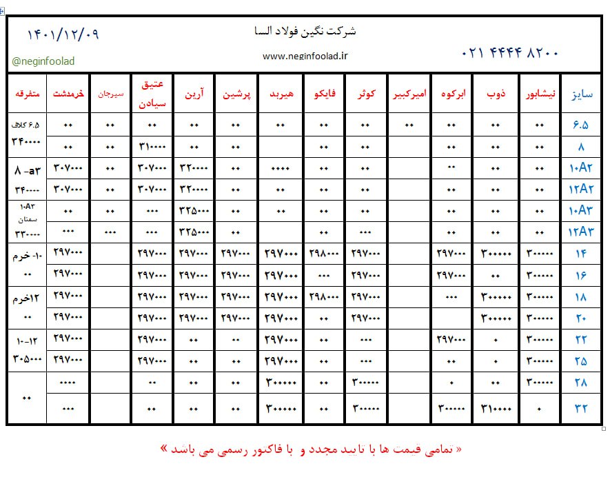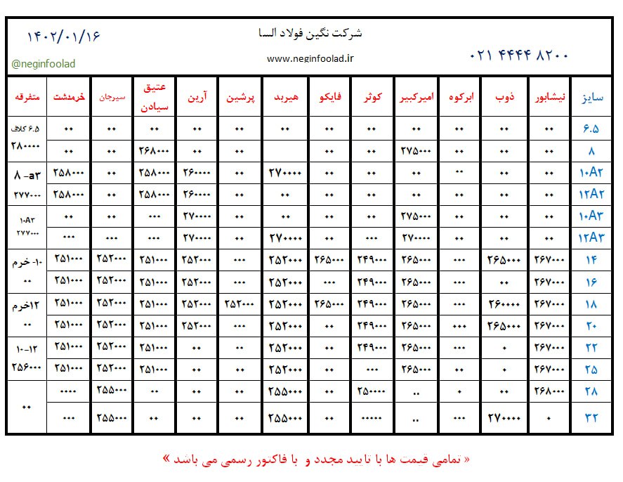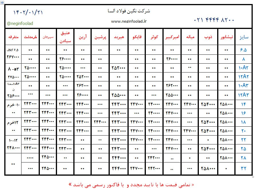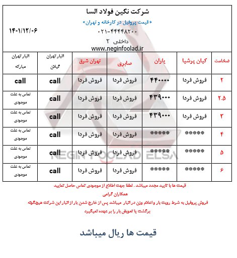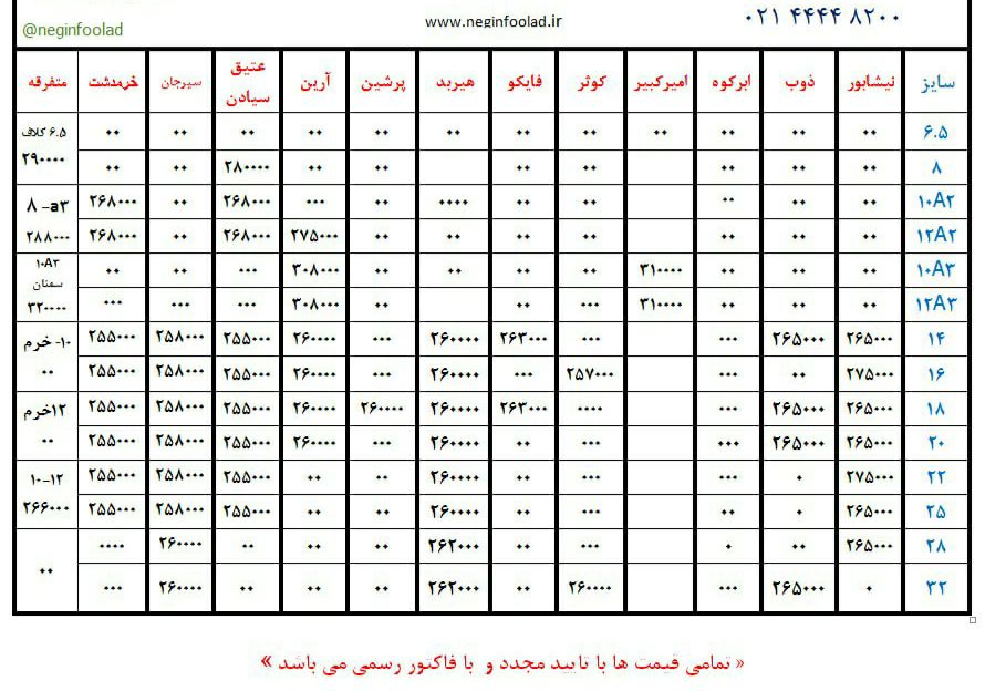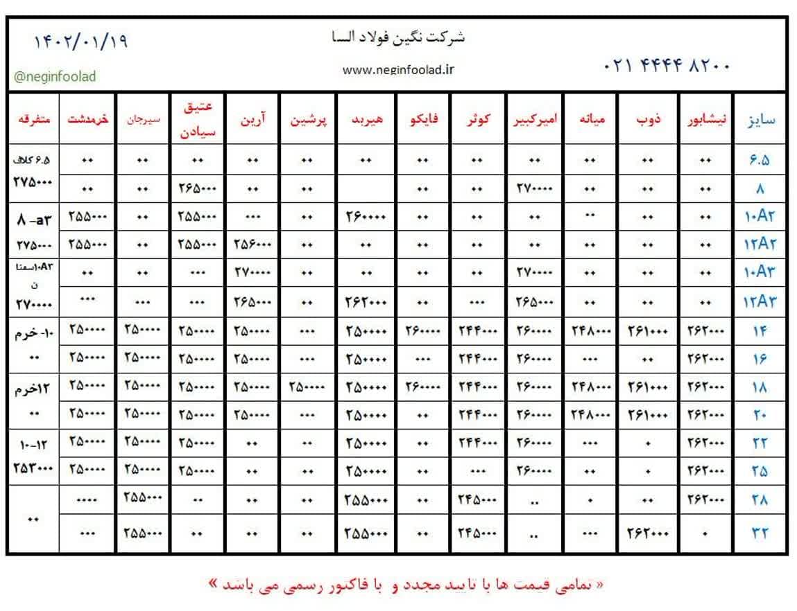 ⬅️شرکت #نگین_فولاد_السا📌نیشابور در انبار تهران ۲۷۵۰۰ 📌میلگرد متفرقه ۲۶۰۰۰ 📌پروفیل ۲/۵ اهوازی انبار تهران ۴۰۰۰۰ ✔️فروش فقط با پول واریزی انجام میگیرد ✅فروش با ف ...