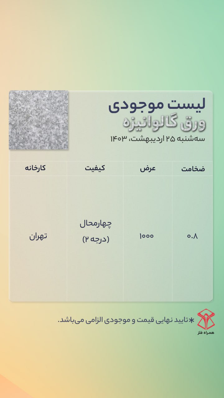 اعلام موجودی ورق گالوانیزه