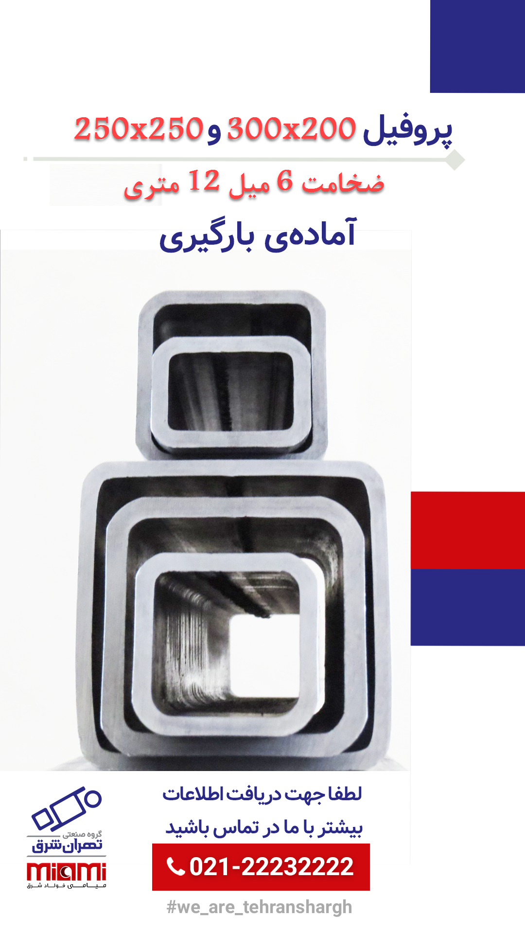 فروش پروفیل های 5 و 6 میل پروفیل 250در 250 ضخامت 6 میل 12 متری پروفیل 300در200 ضخامت 5 میل 12 متری پروفیل 300در200 ضخامت 6 میل 12 متری