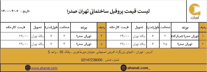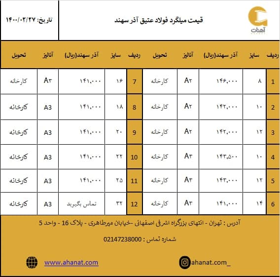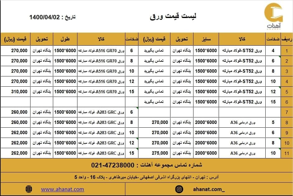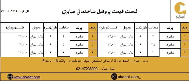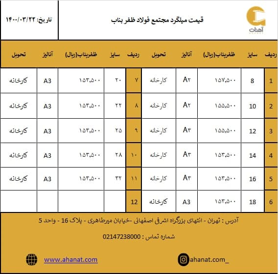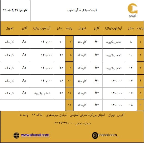 به دلیل نوسانات قیمت جهت اطلاع از تغییرات با کارشناسان ما تماس حاصل فرمایید. ☎️ ۰۲۱-۴۷۲۳۸۰۰۰ 📞 ۰۹۱۹۸۷۷۶۶۴۸ @Ahanat_com www.Ahanat.com