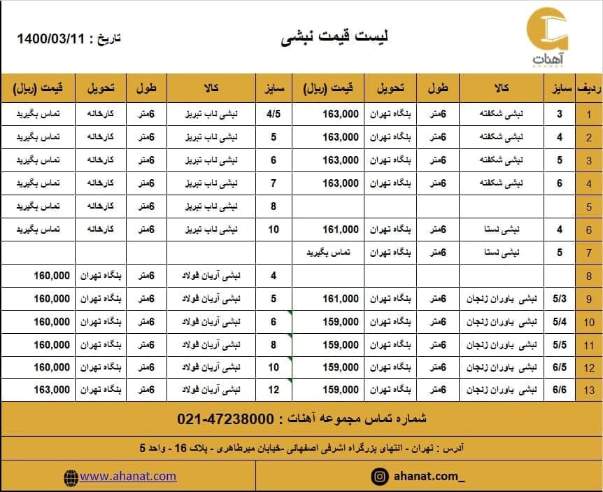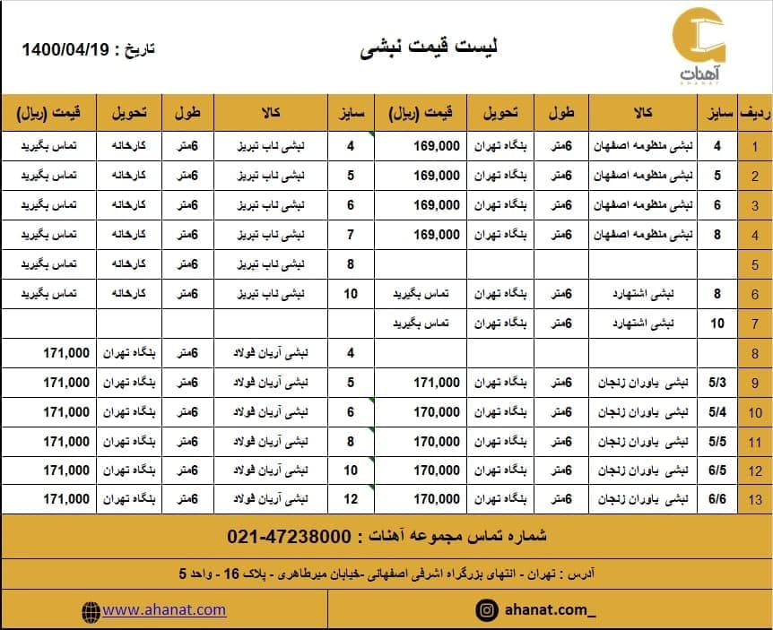 مشخصات و قیمت نبشی به دلیل نوسانات قیمت جهت اطلاع از تغییرات با کارشناسان ما تماس حاصل فرمایید. ☎️ 021-47238000 📞 09198776648