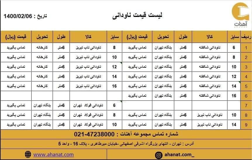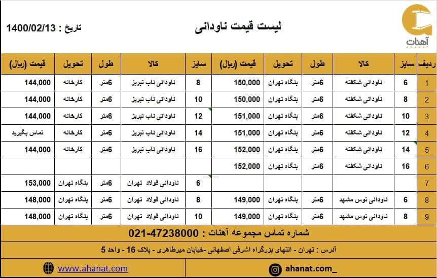 #ناودانی #شکفته #ناب_تبریز #فولاد_تهران #بنگاه_تهران #کارخانه مشخصات و قیمت ناودانی به دلیل نوسانات قیمت جهت اطلاع از تغییرات با کارشناسان ما تماس حاصل فرمایید ...