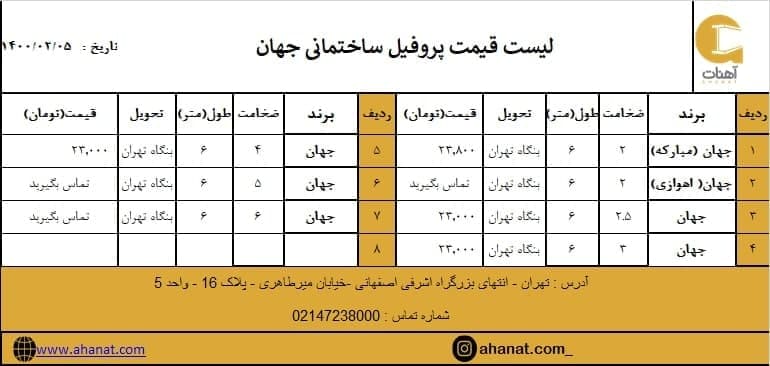 #پروفیل ساختمانی جهان #قیمت_پروفیل #جهان #پروفیل_ساختمانی #قیمت_آهن_آلات #مقاطع_فولادی #پروفیل_جهان #قوطی #آهنات به دلیل نوسانات قیمت جهت اطلاع از تغییرات با ...