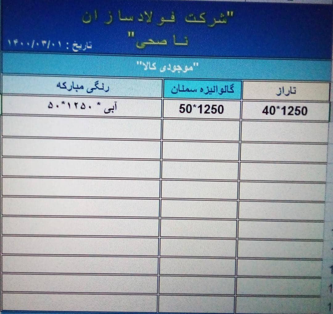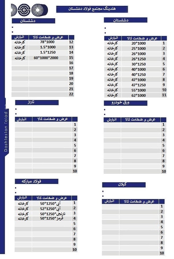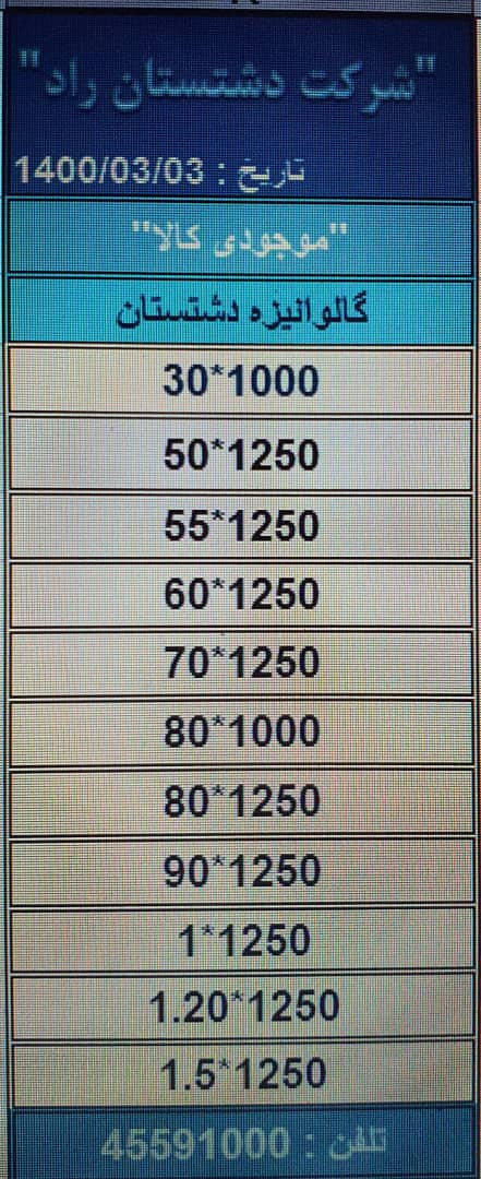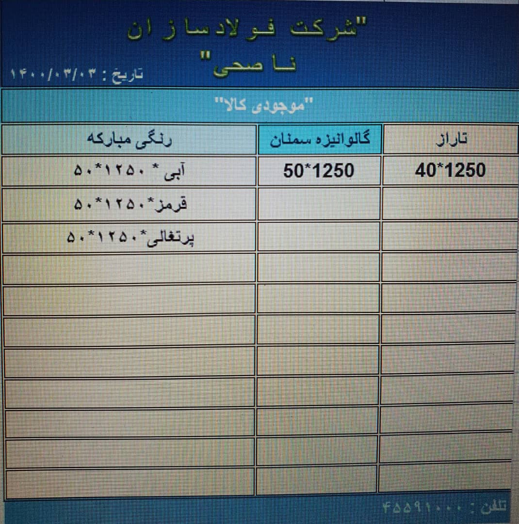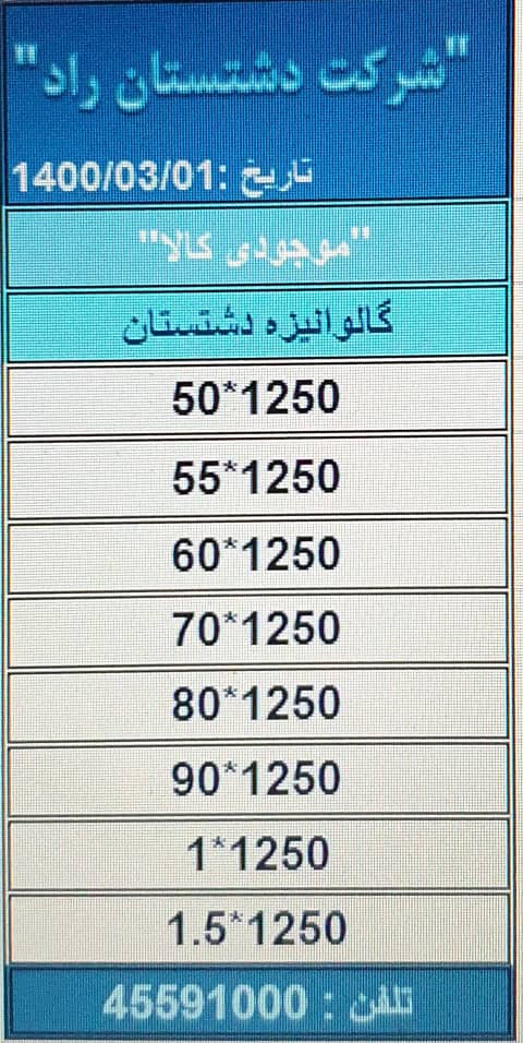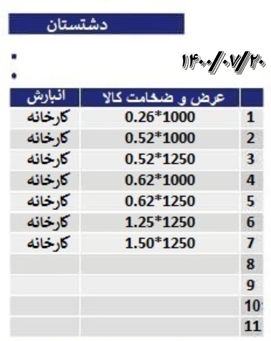 1400/12/02 فروش ضخامت: 1000*0.20 1000*0.25 1000*0.26 1250*0.26 1250*0.30 1000*0.40 1250*0.40 1000*0.47 1250*0.47 1250*0.48 1000*0.55 تماس: 45591000-021 داخلی-30 ...