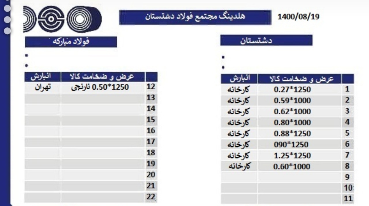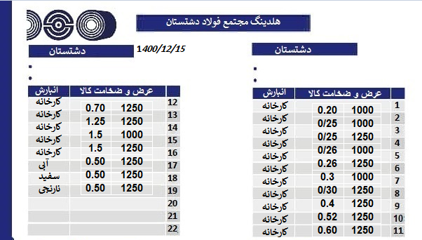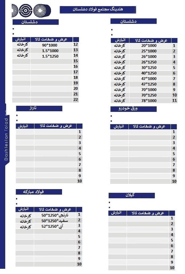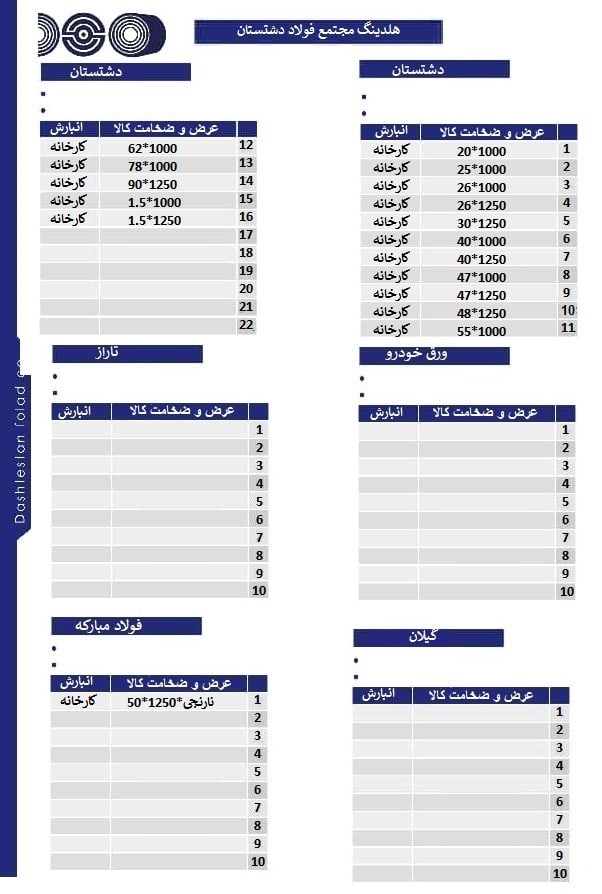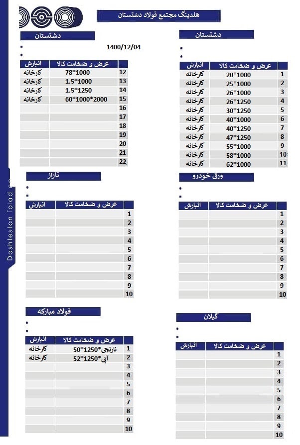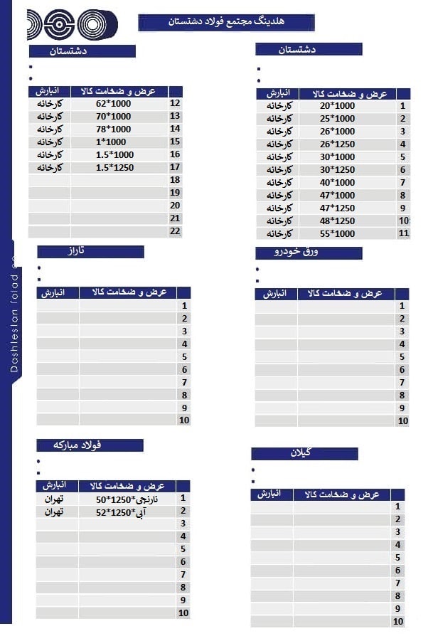 1400/12/02 فروش ضخامت: 1000*0.20 1000*0.25 1000*0.26 1250*0.26 1250*0.30 1000*0.40 1250*0.40 1000*0.47 1250*0.47 1250*0.48 1000*0.55 تماس: 45591000-021 داخلی-30 ...