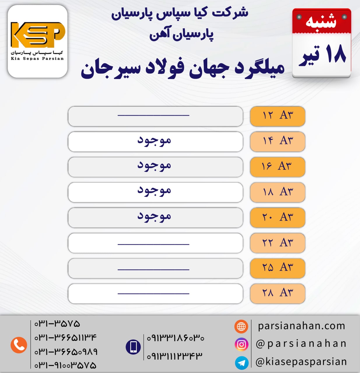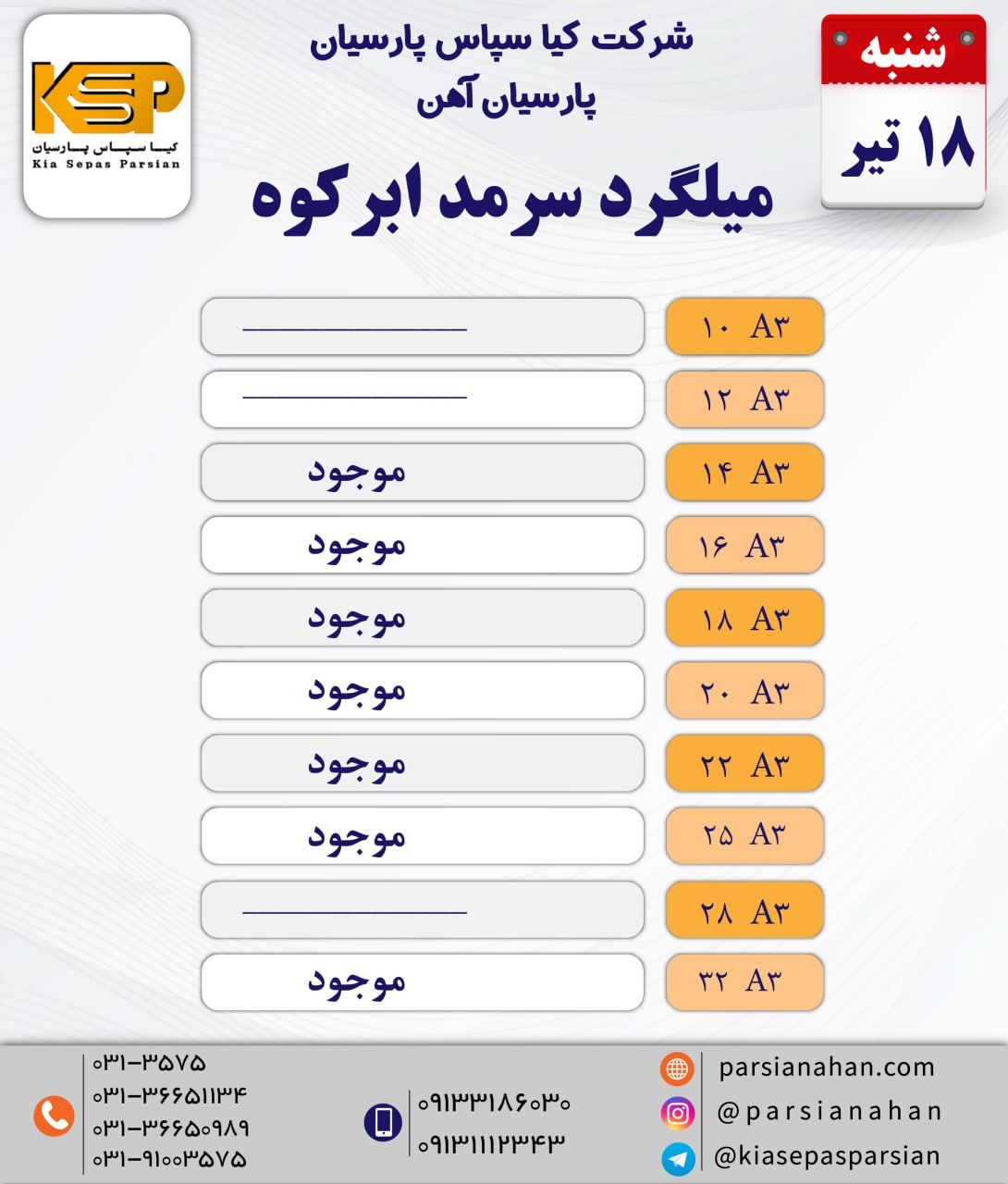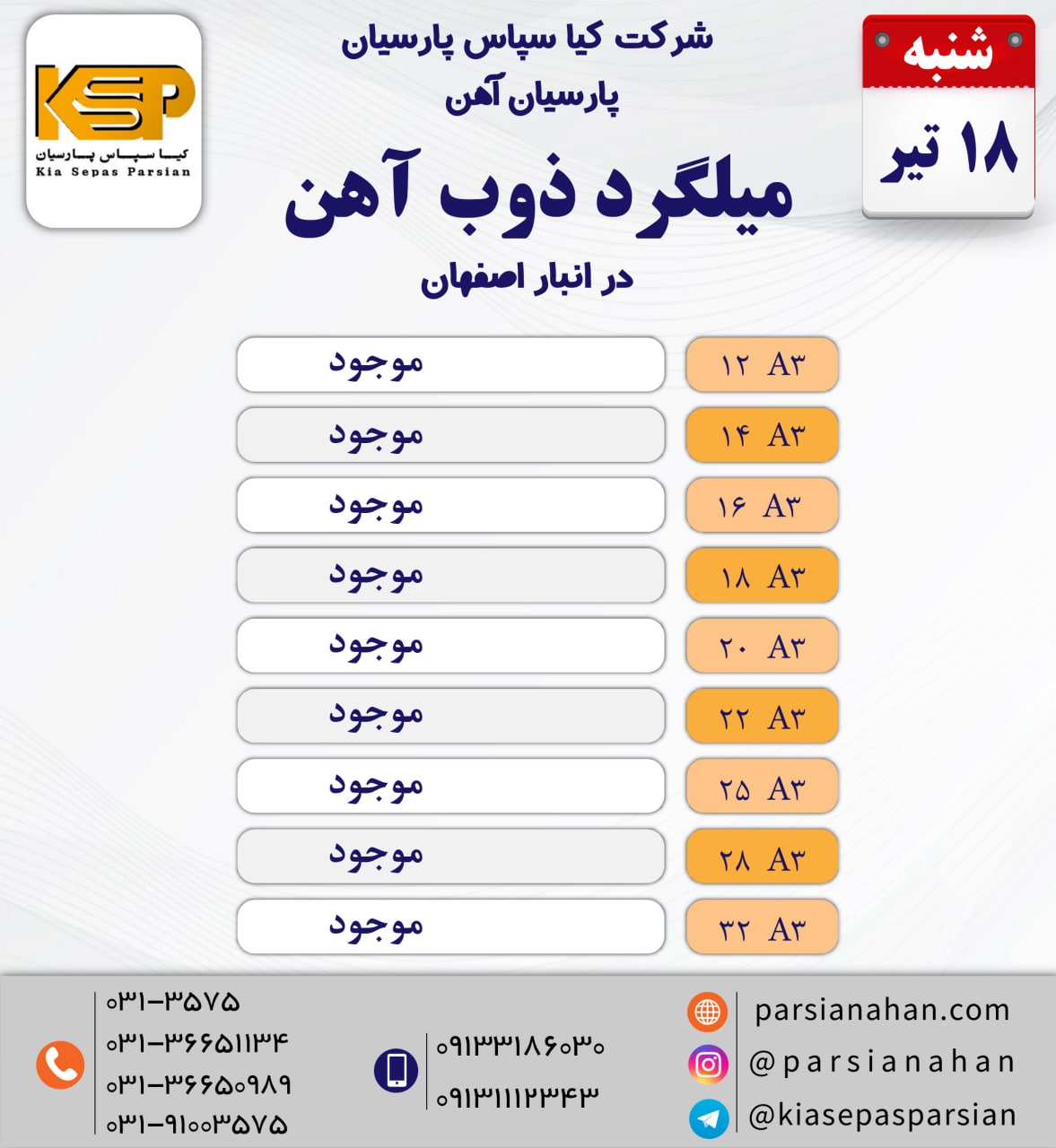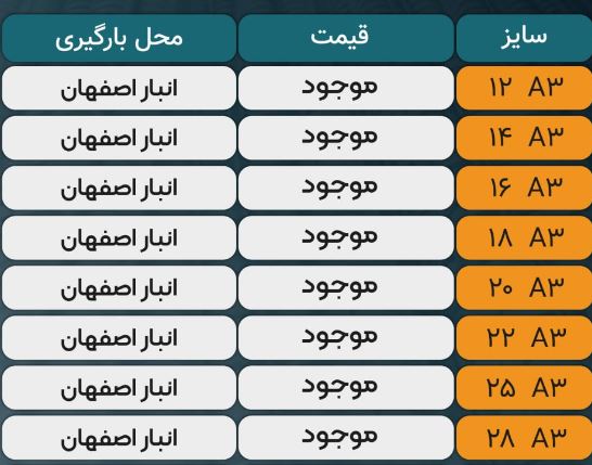 لیست میلگرد ذوب آهن سایز 12 A3 موجود سایز 14 A3 موجود سایز 16 A3 موجود سایز 18 A3 موجود سایز 20 A3 موجود سایز 22 A3 موجود سایز 25 A3 موجود سایز 28 A3 مو ...