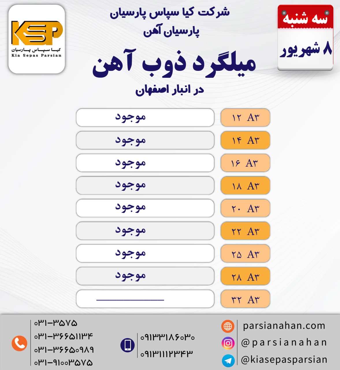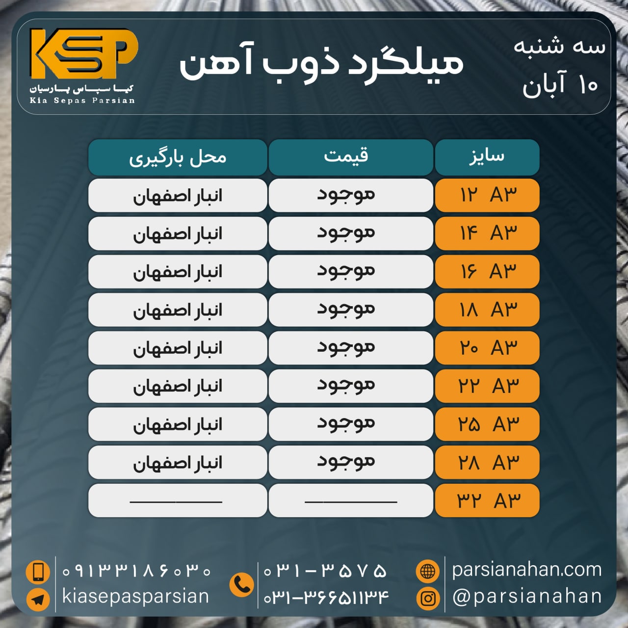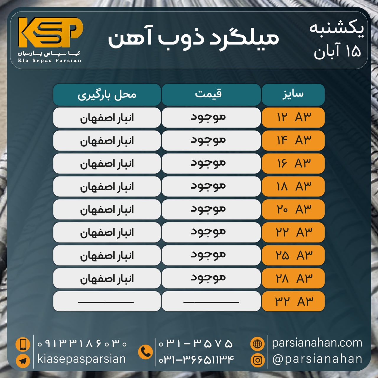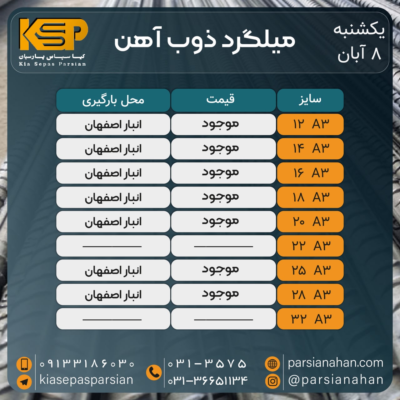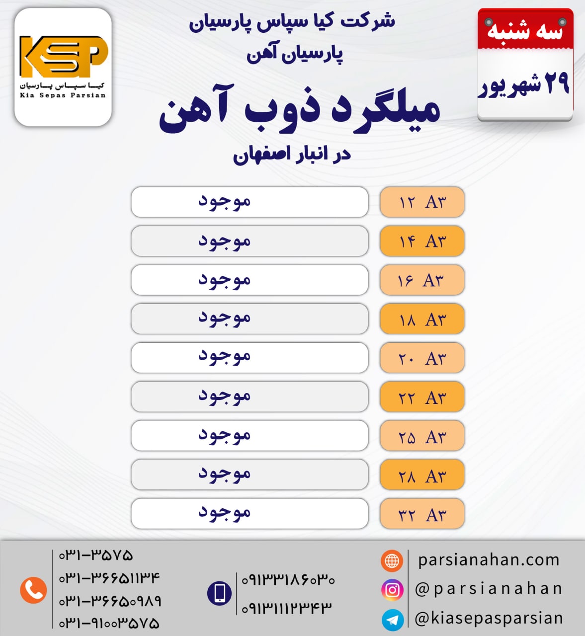 لیست میلگرد ذوب آهن در انبار اصفهان