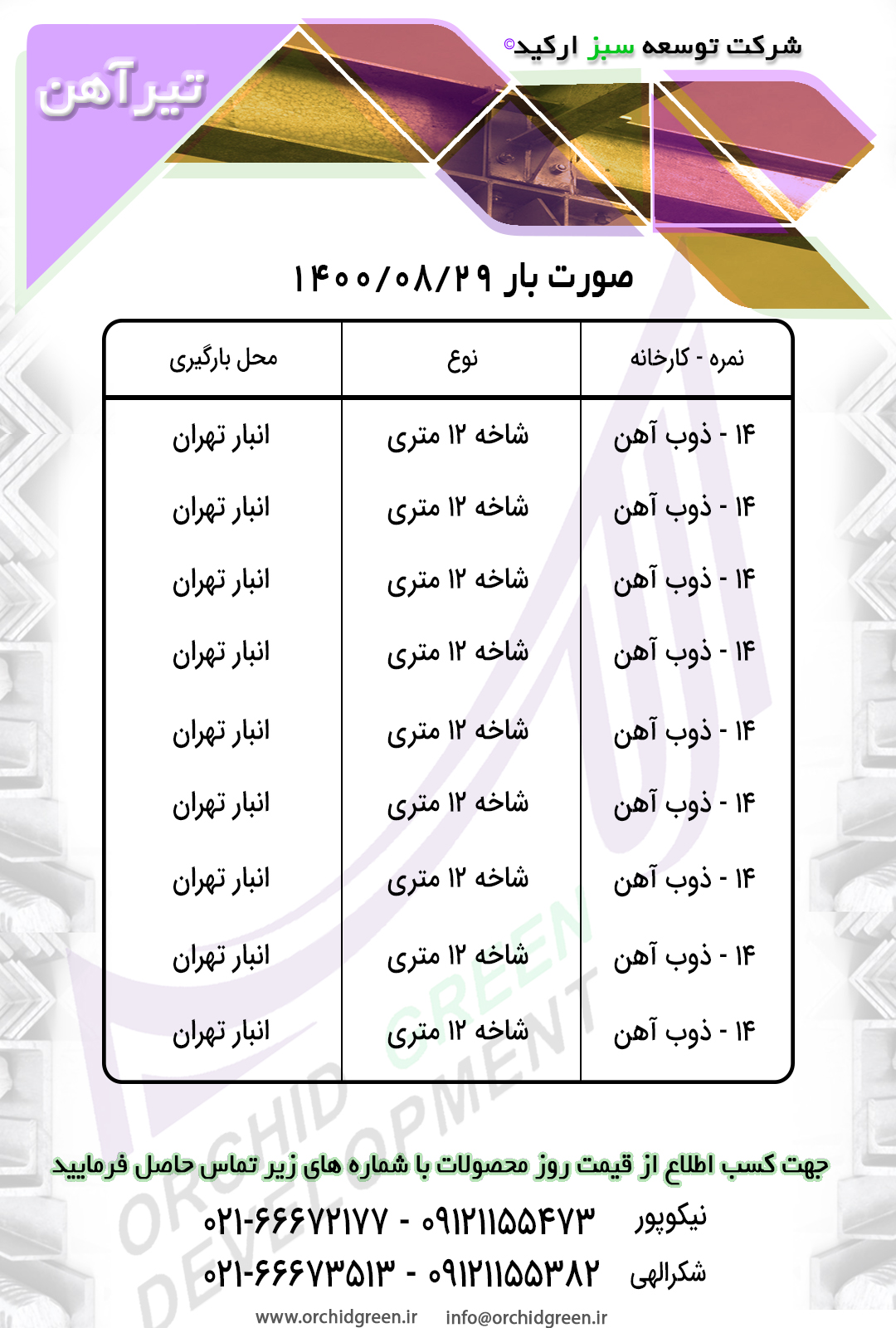 برای خرید تیرآهن های شاخه با ما تماس بگیرید : اطلاعات تماس در زیر صورت بار پیوستی موجود می باشد صورت بار تا شنبه 23 بهمن ماه 1400 معتبر می باشد.