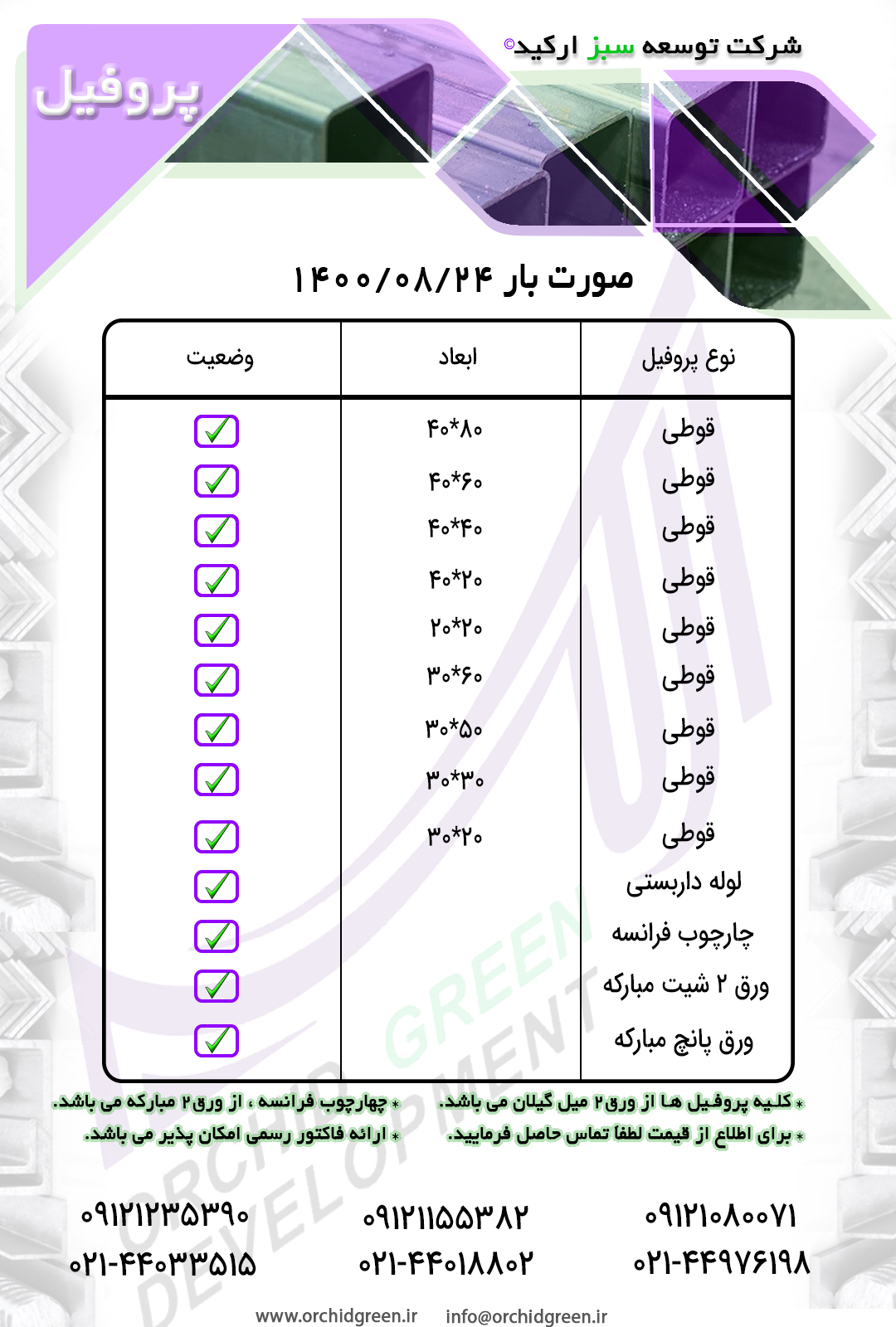 برای خرید انواع قوطی و پروفیل به شماره واتساپ 09332928115 و یا وبسایت : www.orchidgreen.ir مراجعه نمایید .
