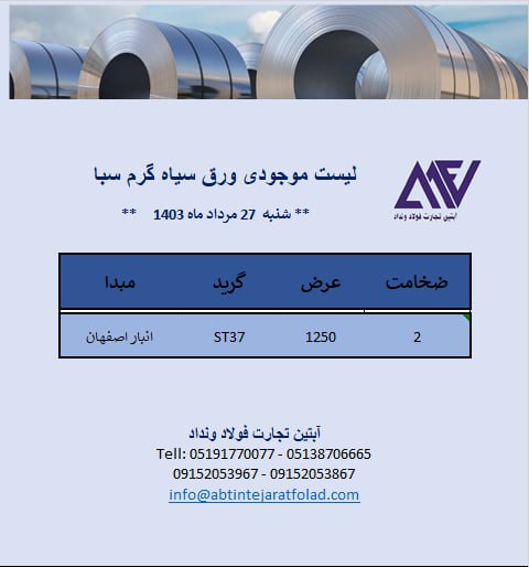 ✳️#آبتین_تجارت_فولاد_ونداد ⬅️ توزیع انواع ورق های فولادی از مبادی: 🔸ورق روغنی فولاد غرب آسیا 🔸ورق سیاه گیلان 🔸ورق سیاه مبارکه 🔸ورق گالوانیزه ☎️ 05191770077 ☎️ ...