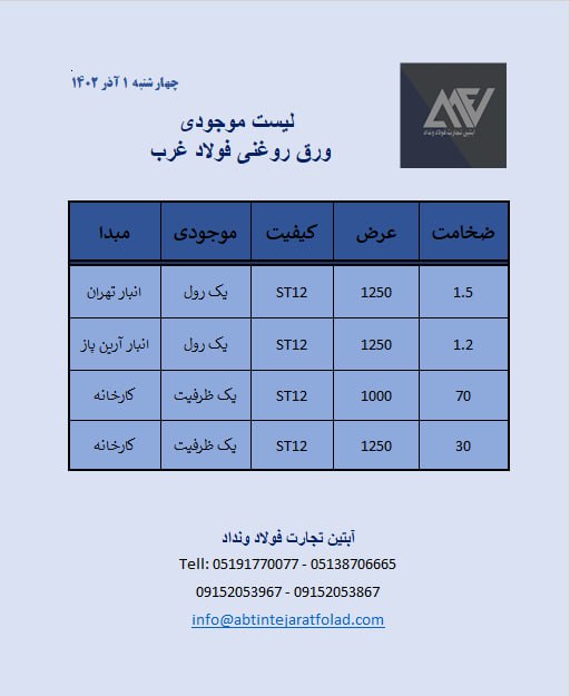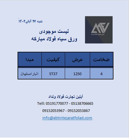 [ ✳️#آبتین_تجارت_فولاد_ونداد ⬅️ توزیع انواع ورق های فولادی از مبادی: 🔸ورق روغنی فولاد غرب آسیا 🔸ورق سیاه گیلان 🔸ورق سیاه مبارکه 🔸ورق گالوانیزه #جهت_مشاهده_پروف ...