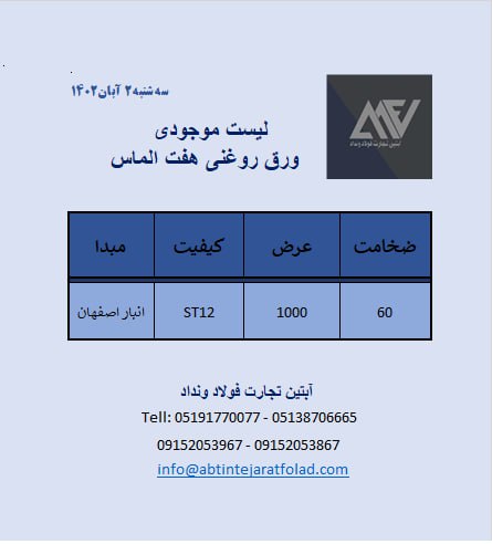 [ Album ] ✳️#آبتین_تجارت_فولاد_ونداد ⬅️ توزیع انواع ورق های فولادی از مبادی: 🔸ورق روغنی فولاد غرب آسیا 🔸ورق سیاه گیلان 🔸ورق سیاه مبارکه 🔸ورق گالوانیزه #جهت_مشا ...