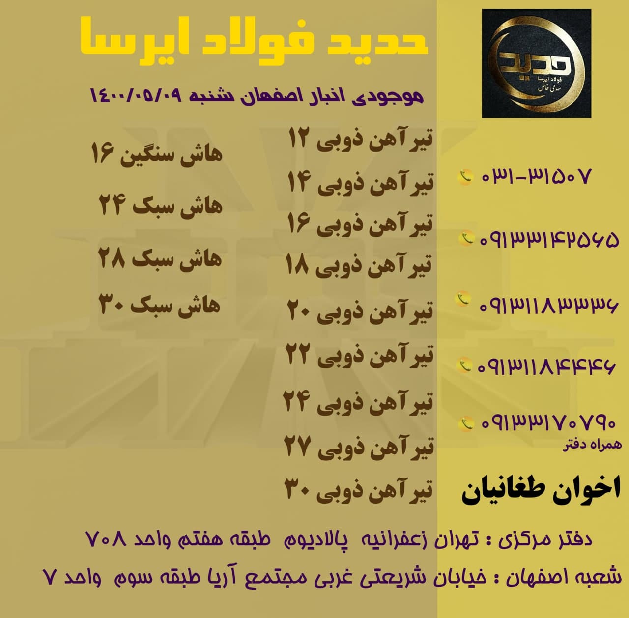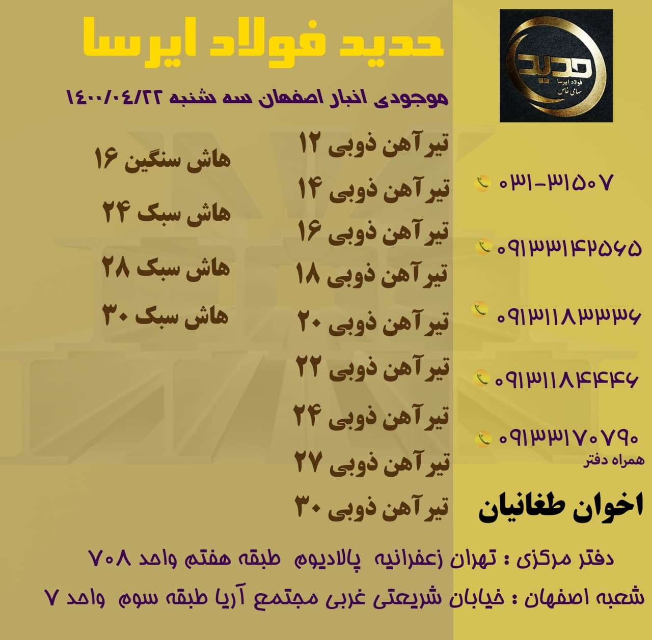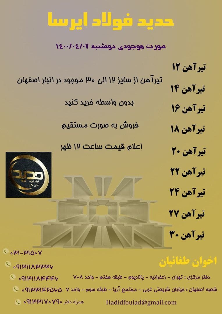 🗓 امروز سه شنبه 19مرداد ماه ۱۴۰۰. ✅صورت موجودی عرضه ی مستقیم تیرآهن ذوب آهن (اخوان طغانیان) 031-31507 09133142565 09131183336 09131184446 دفتر: 09133170790