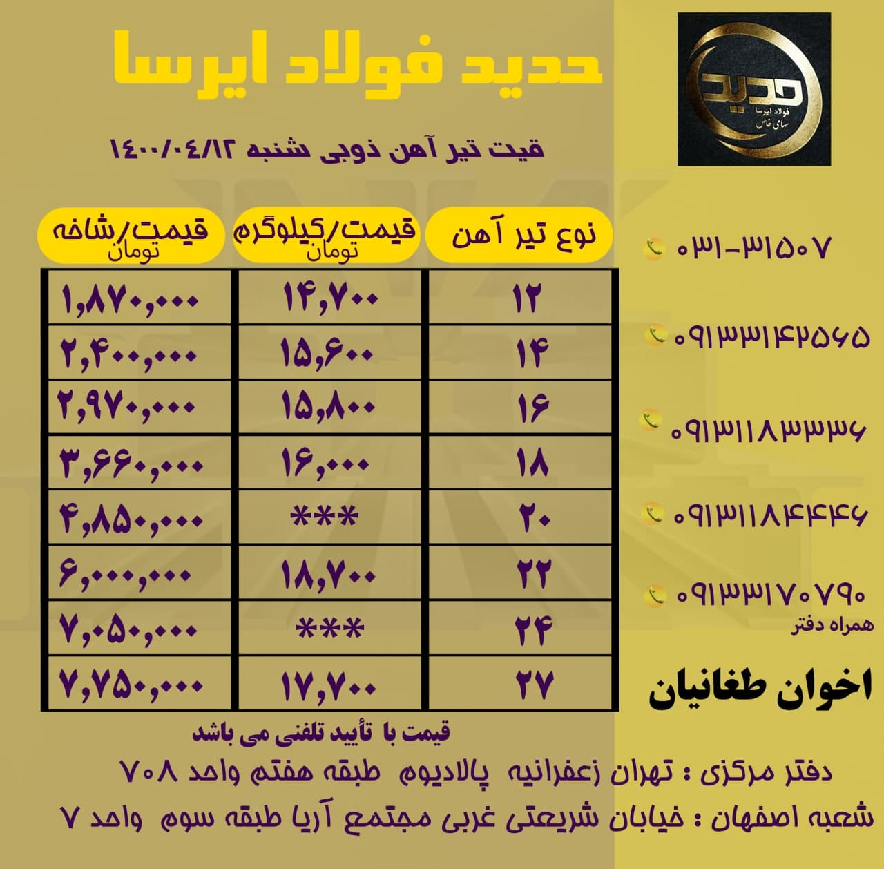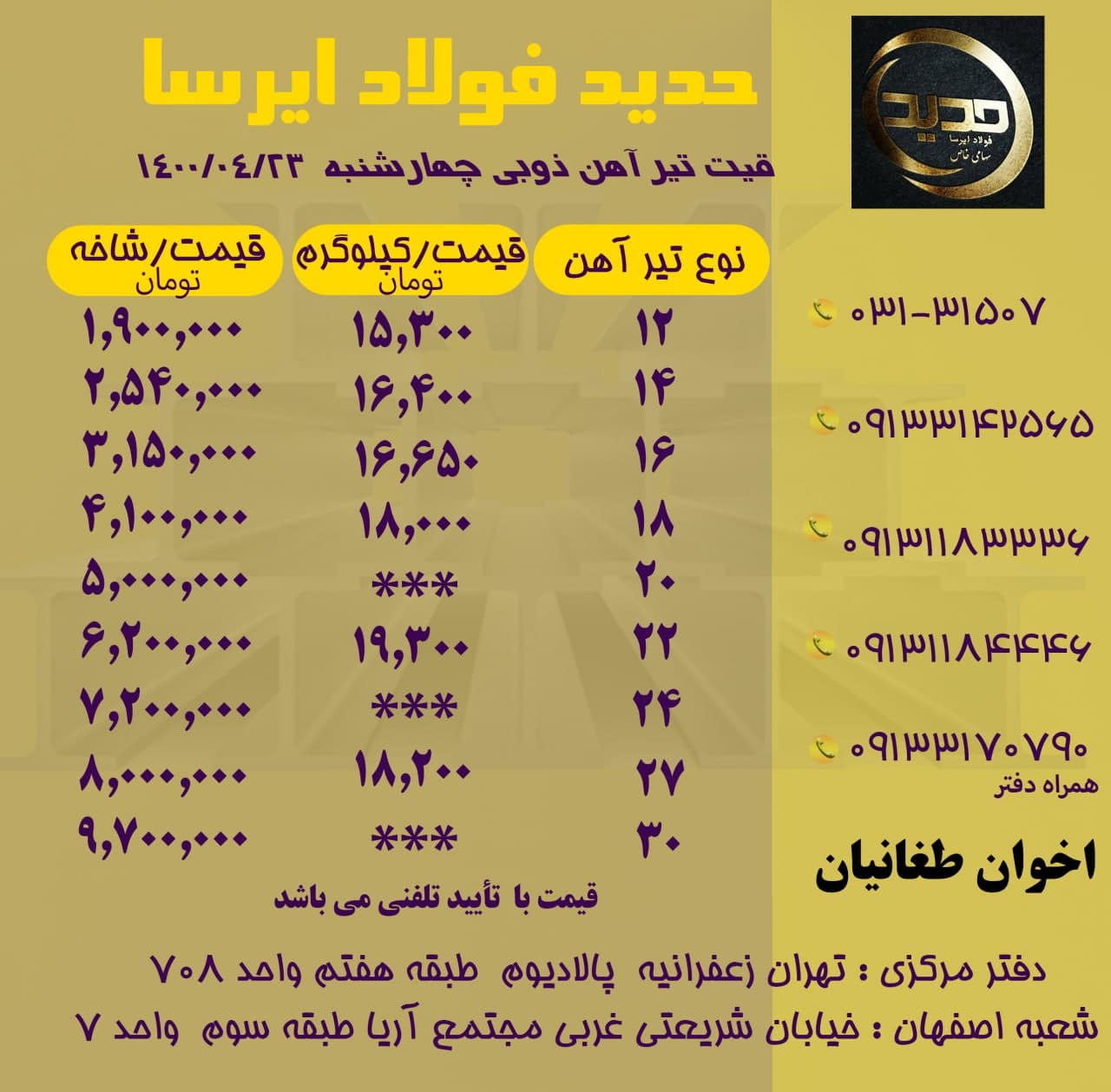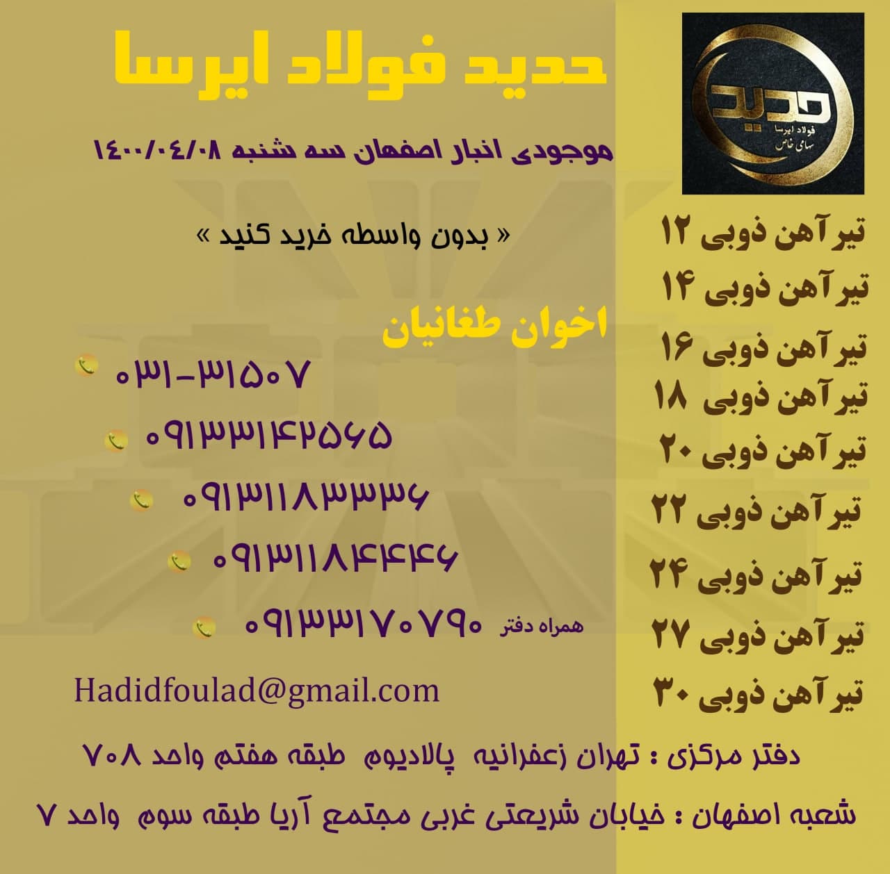 🗓 امروز سه شنبه 19مرداد ماه ۱۴۰۰. ✅صورت موجودی عرضه ی مستقیم تیرآهن ذوب آهن (اخوان طغانیان) 031-31507 09133142565 09131183336 09131184446 دفتر: 09133170790