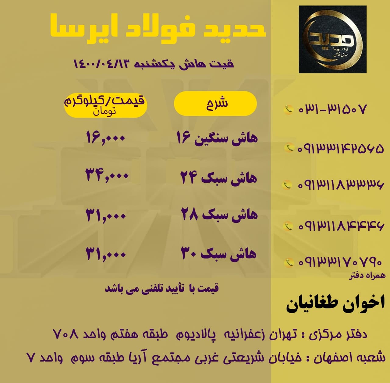 🗓 امروز سه شنبه 12 مرداد ماه ۱۴۰۰. ✅قیمت تیرآهن هاش (بنگاه اصفهان) ✅قیمت ها با تایید میباشد.